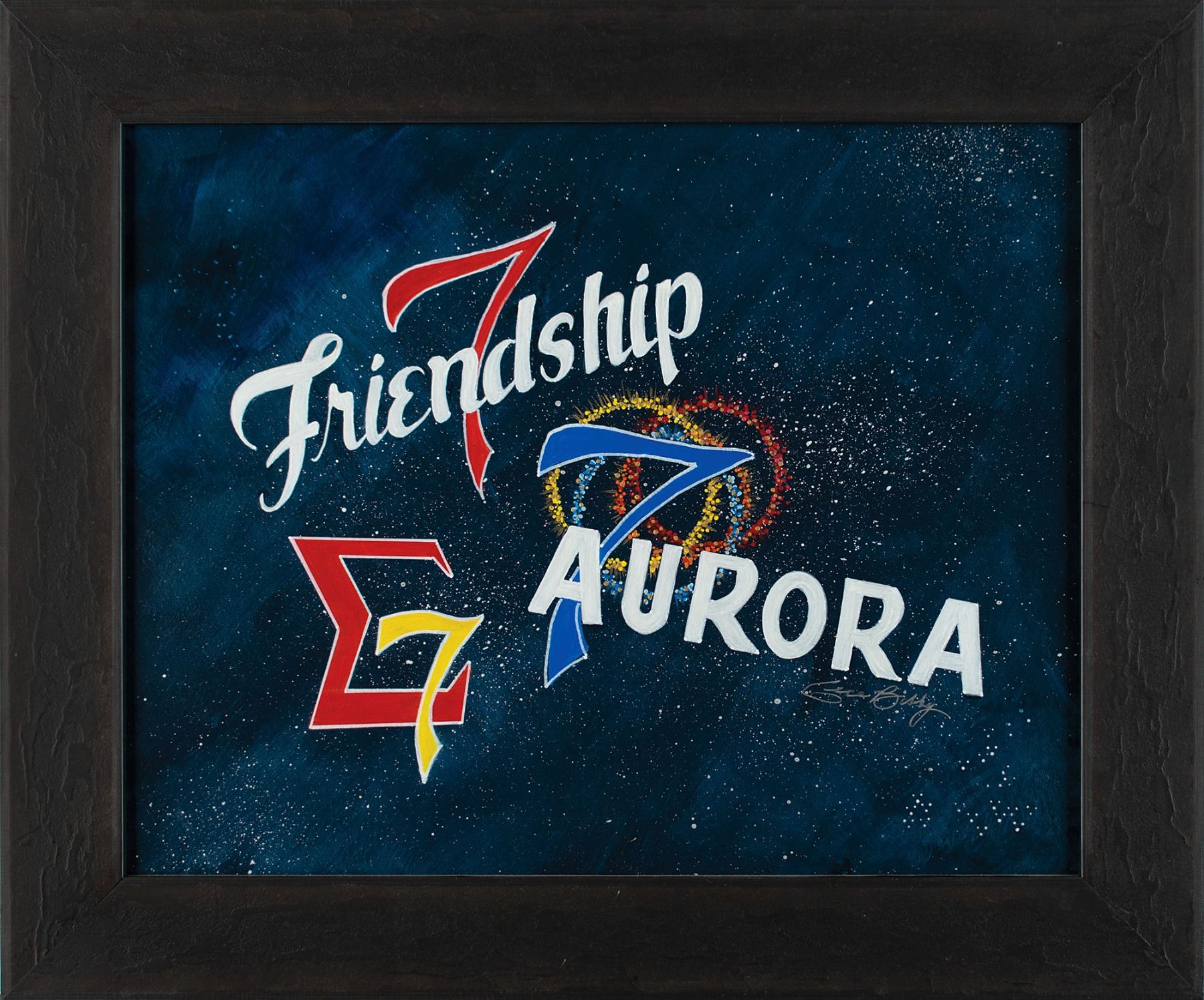 Original painting of the Friendship 7, Aurora 7, and Sigma 7 mission emblems by Cece Bibby, accomplished in acrylic on a 13.5 x 10.5 artist’s canvas panel, signed in the lower right in silver ink by the artist. Framed without glass to an overall size of 17 x 14.25. In fine condition. In 1959, Bibby was hired by Chrysler Aerospace and soon began work as a contract artist for NASA, her workspace located just across the street from the astronaut office. Not a fan of the stencil designs on the Freedom 7 and Liberty Bell 7, John Glenn recruited Bibby in 1962 to design and paint by hand the emblem for his Friendship 7 spacecraft. In addition to Glenn, Bibby went on to create the designs for Scott Carpenter's Aurora 7 and Wally Schirra's Sigma 7 capsules, subsequently becoming the first and only woman to ascend the Mercury launch gantry and go inside the ‘white room’ that surrounded the vehicle.