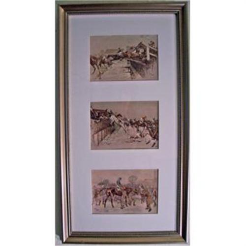 This is a wonderful 1920 series of Steeplechase lithograph prints by Cecil Aldin. They show the race from start to finish. Note the fallen jockey in print #2, trying to save himself from serious injury or death. These are original 1920 prints, not reproductions. Size of the picture is 10?X20?. Frame is contemporary, Silver colored with side beading. Mat is cream colored.