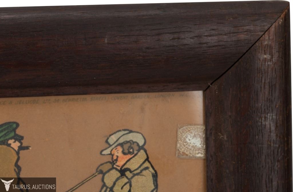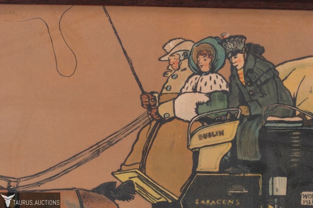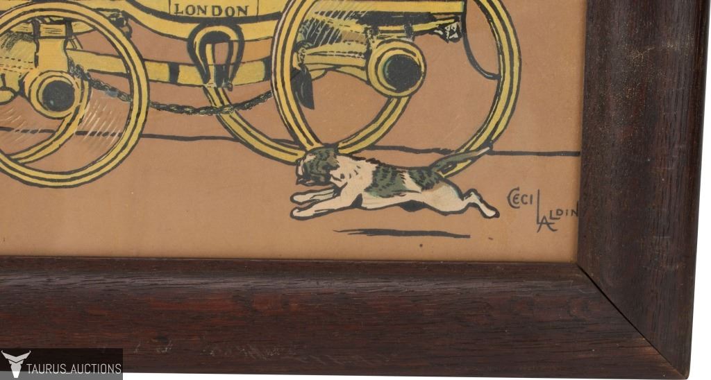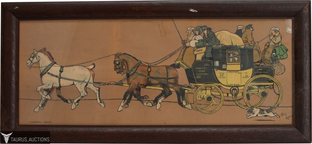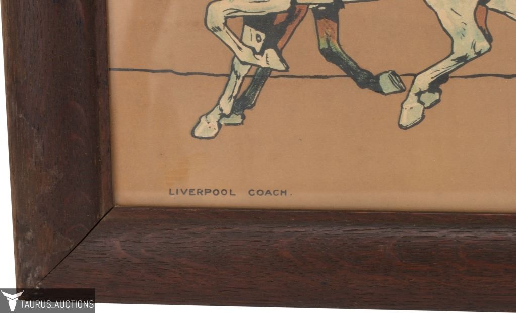 Item/Description: After Cecil Aldin (1870-1935) The Liverpool Coach. Wood framed chromolithograph print of The Liverpool Stage Coach, published Lawrence and Jellicoe, 1907. Image features a horse drawn coach with figures and a dog running beside. Signed in plate lower right. Publisher info along top.
