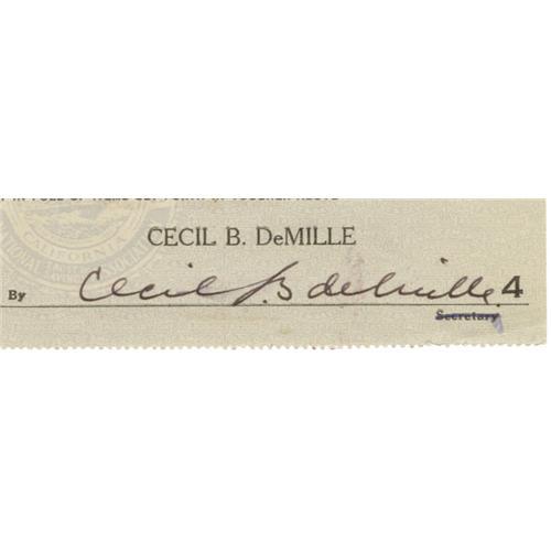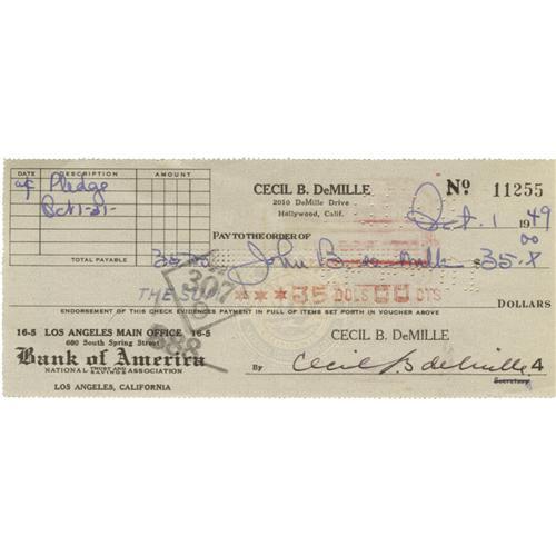 <B>Cecil B. DeMille Signed Checks.</B></I> A pair of personal checks, both dated October 1, 1949, written to his wife Constance and son John B. DeMille, in Excellent condition with mild wear and the usual bank cancellation marks.<I>Accompanied by LOA from PSA/DNA.</B></I><BR><BR><b>Shipping:</b> Small Flat (<a target="_blank" href="http://www.heritageauctions.com/common/shipping.php">view shipping information</a>) <BR><BR><B>Important notice:</