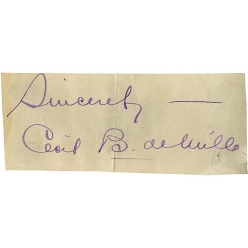 <B>Cecil B. de Mille and Carl Laemmle Signatures.</B></I> Here is a set of cut signatures from two of the most influential people of the Hollywood's heyday; one from epic director Cecil B. de Mille in purple ink and one from Universal Pictures studio founder Carl Laemmle in black ink. Both are excellent specimens. <I>With COA from PSA/DNA.</B></I>