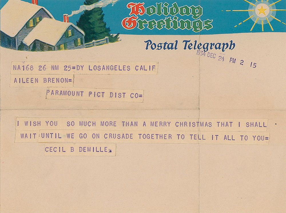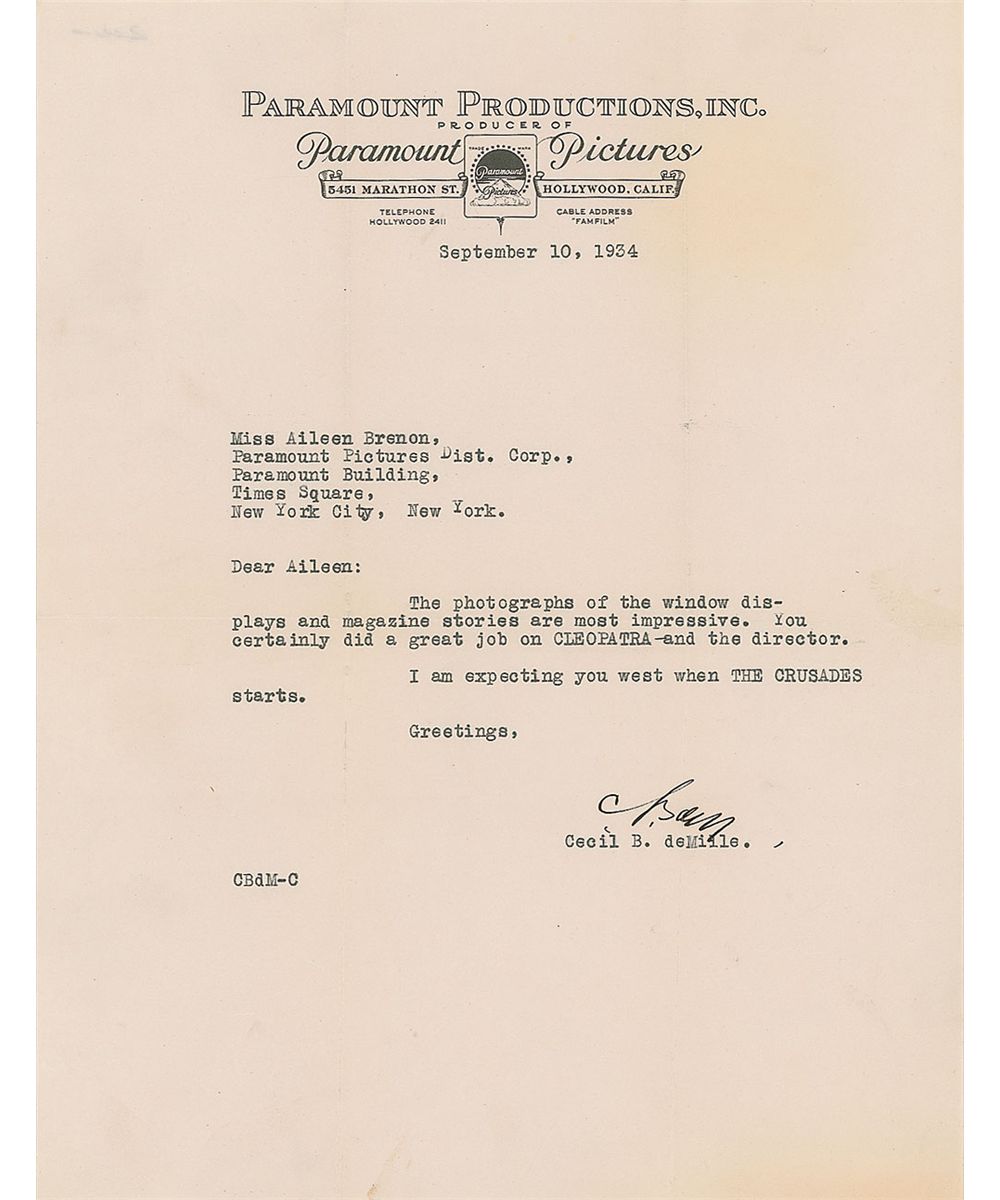 TLS signed “C. B. De M,” one page, 8.25 x 10.75, Paramount Productions, Inc. letterhead, September 10, 1934. Short letter to Aileen Brenon. In full: “The photographs of the window displays and magazine stories are most impressive. You certainly did a great job on Cleopatra and the director. I am expecting you west when The Crusades start.” In fine condition, with intersecting folds, one through a single letter of signature. Accompanied by an unsigned photo of deMille and Brenon, as well as a 1934 telegraph from deMille to Brenon sending Christmas wishes.