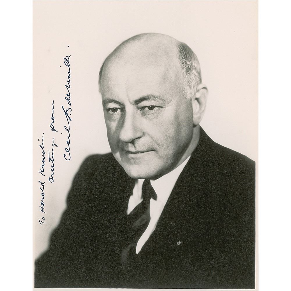 Vintage matte-finish 7.5 x 9.75 photo of the moviemaking pioneer in a suit and tie, signed and inscribed in fountain pen, "To Harold Krevolin, Greetings from Cecil B. deMille.” In fine condition.