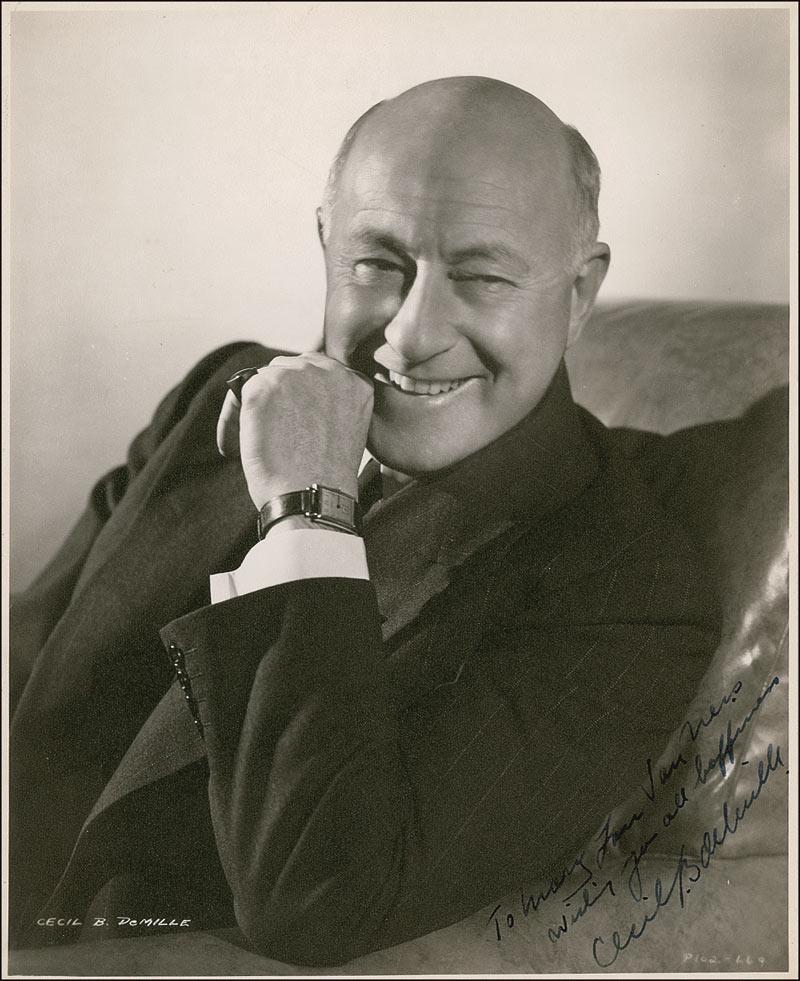Vintage matte-finish 7.5 x 9.5 photo, signed and inscribed in fountain pen “To Mary Jane Van Ness, Wishing you all happiness, Cecil B. deMille.” In fine condition, with a few trivial edge creases and mounting remnants on reverse.