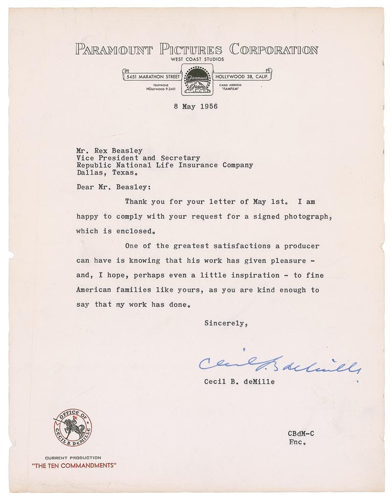 TLS, one page, 8.5 x 11, Paramount Pictures Corporation letterhead, May 8, 1956. Letter to Rex Beasley, Vice President of Republic National Life Insurance Company. In full: “Thank you for your letter of May 1st. I am happy to comply with your request for a signed photograph, which is enclosed. One of the greatest satisfactions a producer can have is knowing that his work has given pleasure-and, I hope, perhaps even a little inspiration-to fine American families like yours, as you are kind enough to say that my work has done.” Printed at the bottom of deMille’s stationery is “Current Production ‘The Ten Commandments.’” Dings to vertical edges, scattered light creases with a larger vertical crease to left side, and mild edge toning, otherwise fine condition.