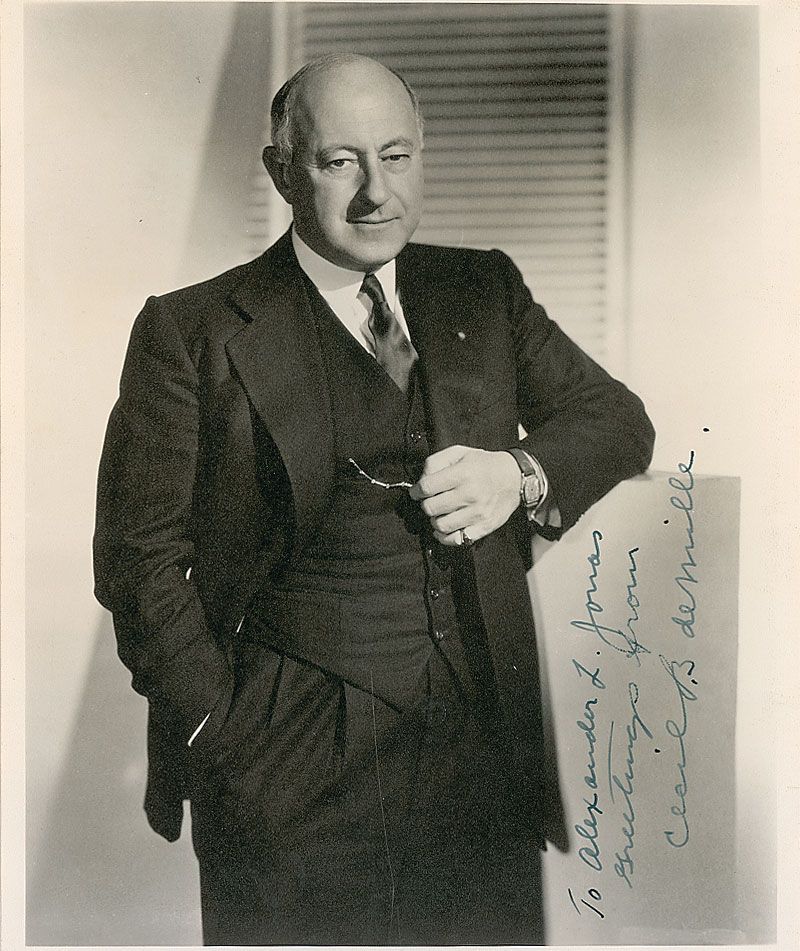 Vintage matte-finish 8 x 9.5 photo, signed and inscribed vertically in fountain pen “To Alexander L. Jonas, greetings from Cecil B. deMille.” In fine condition, with trimmed horizontal edges and mild mounting remnants to reverse from previous display in a