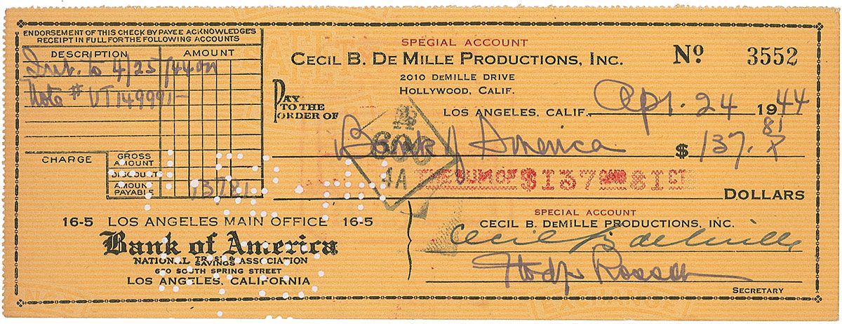 Cecil B. deMille Productions, Inc. business check, 8.5 x 3, filled out in another hand and signed by deMille, payable to Bank of America for $137.81, April 24, 1944. In fine condition, with expected stamps and cancellation holes, one slightly touching first stroke of signature.