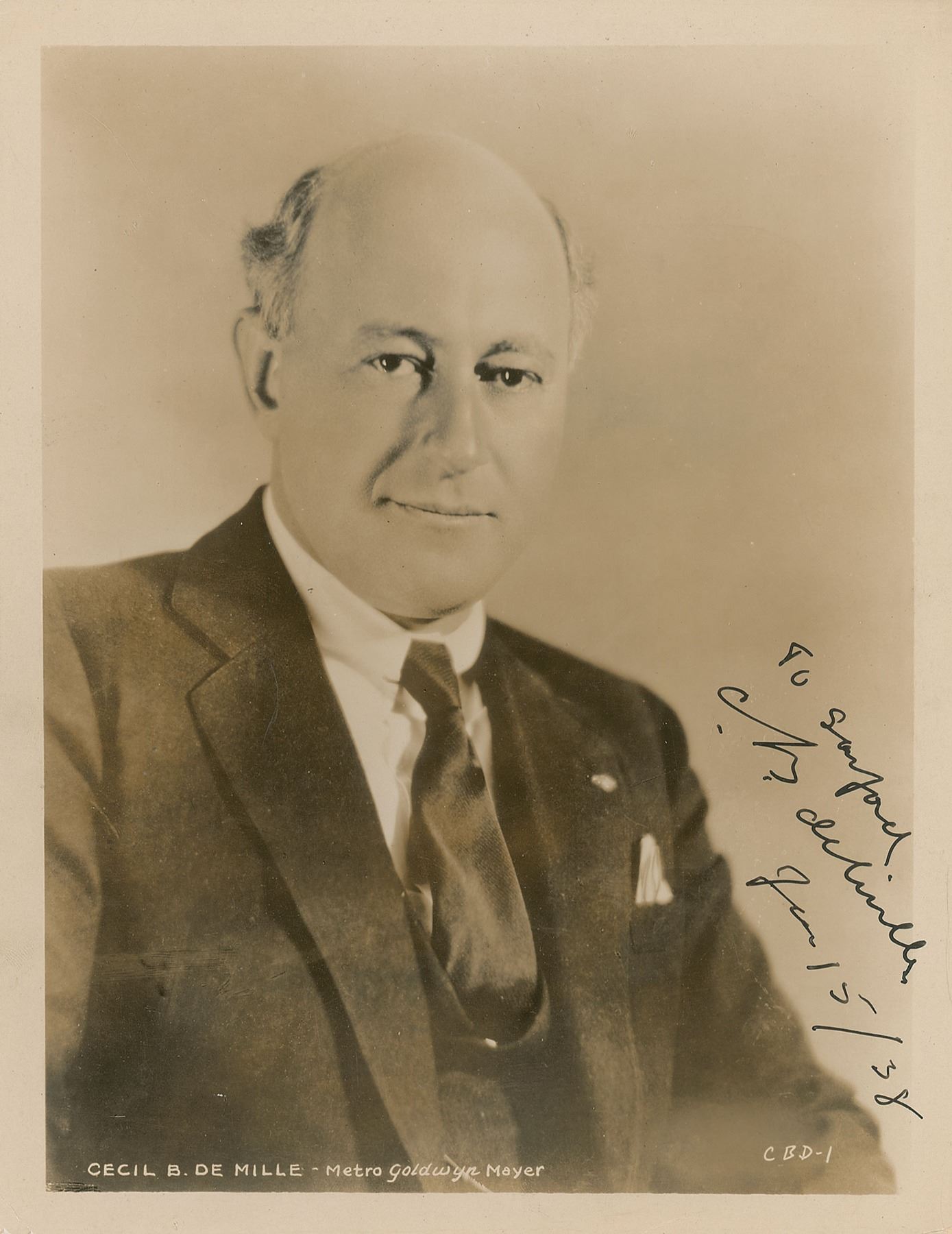 Vintage glossy 8 x 10.25 MGM publicity photo of the Oscar-winning director and producer in a formal bust-length pose, signed and inscribed in black ink, "To Sanford, C. B. deMille, Jan 15/38.” In fine condition, with scattered creasing and crazing.