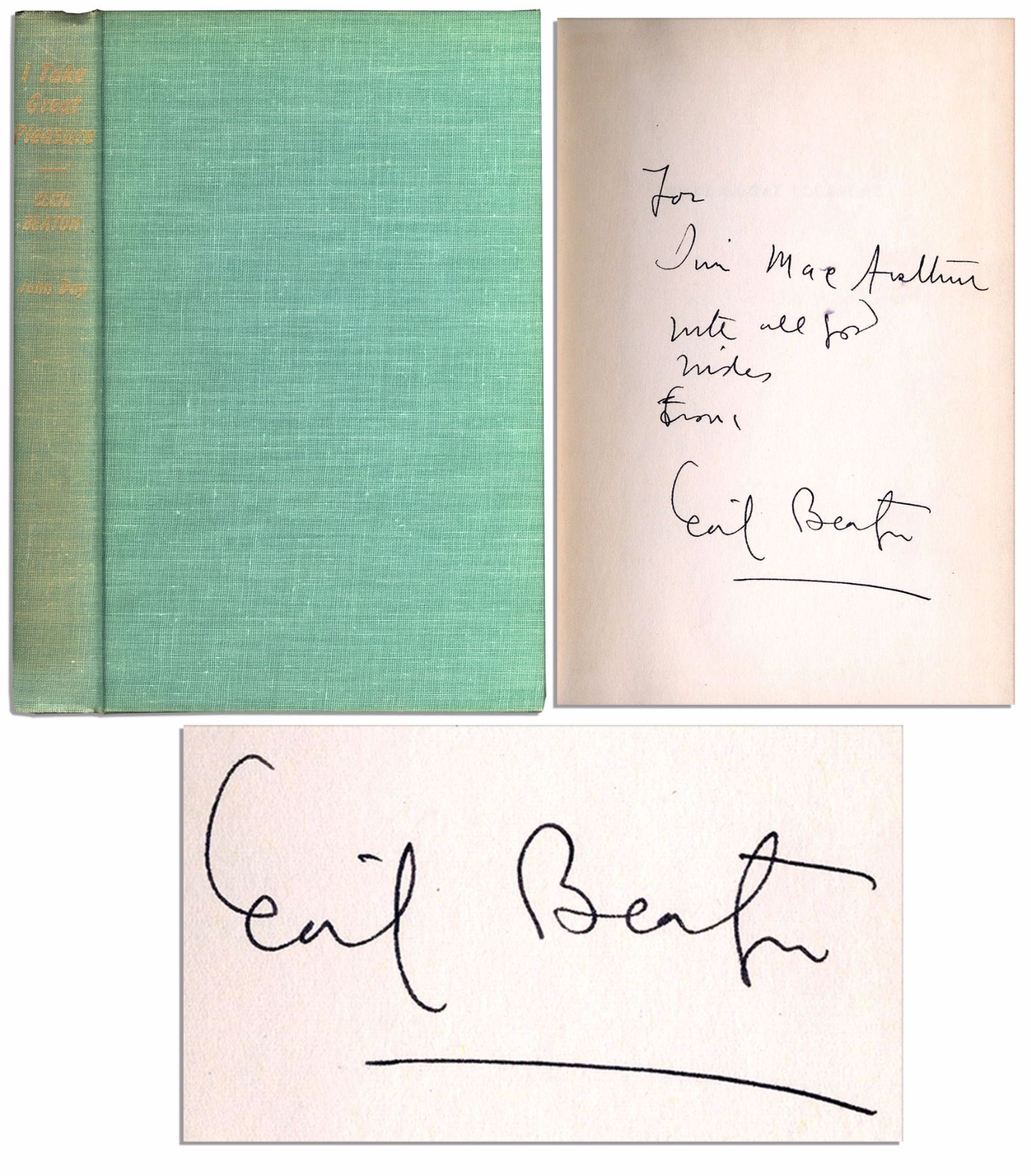 Cecil Beaton signed copy of ''I Take Great Pleasure'', published by the John Day Company: New York: 1956. Photographer and costume designer Beaton's autograph inscription to the front free endpaper dedicates the book to the son of actress Helen Hayes. Dedication reads in full, ''For Jim MacArthur / with all best wishes from / Cecil Beaton''. Beaton's satire about Americans runs 214pp. Bound in jade cloth boards to an overall size of 5.5'' x 8.25''. MacArthur's bookplate with his name is affixed to front pastedown. Toning to leaves and sunning to backstrip, else near fine. From the estate of Helen Hayes.
