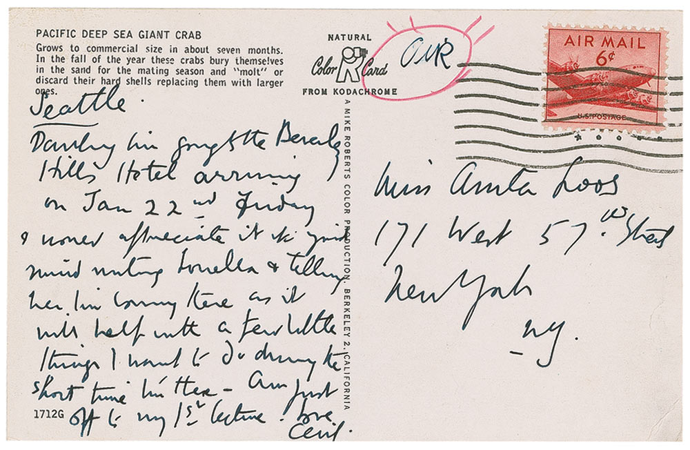 Academy Award–winning British photographer and costume and production designer (1904–1980). ALS signed “Cecil,” on a 5.25 x 3.5 picture postcard, no date. Postcard to Anita Loos in Beaton’s difficult to decipher hand. In part; “Darling, I’m going to the Beverly Hills Hotel…and would appreciate it of you mind writing Louella [Parsons] & telling her I’m coming…Am just off to my 1st lecture.” In fine condition.