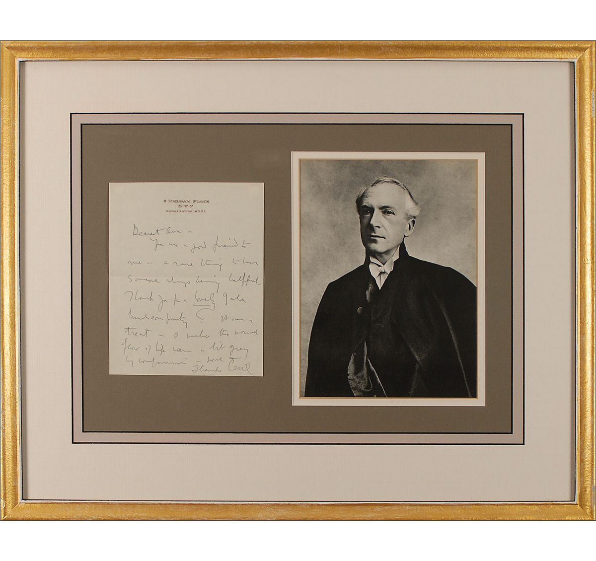 ALS signed “Cecil,” one page, 5.5 x 7, personal letterhead, no date. Letter to Ava Anderson, wife of John Anderson, 1st Viscount Waverley. In full: “You are a good friend to me—a rare thing to have someone always being helpful. Thank you for a lovely gala luncheon party—it was a treat—it makes the normal flow of life seem a bit grey by comparison.” Double matted and framed with a portrait of Beaton to an overall size of 21.5 x 17.5. In fine condition, with some show-through from mounting adhesive.