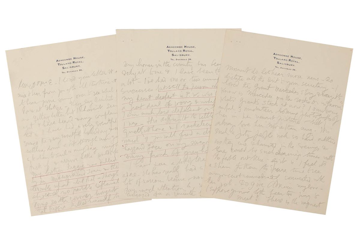 ALS signed “Mr. B,” three pages both sides, 5.75 x 8, Ashcombe House letterhead. Letter to a friend. In part: ”They say British pictures are getting better but I haven't seen Henry 8 yet & have heard many complaints about that—I have had a very eventful time since the very eventful holiday…My brother Reggie was killed one night by an Underground Train & there was a terrible upset about that—Though there seemed absolutely no possible explanation for him doing so the coroner brought in a verdict that Reggie killed himself but I am convinced that he never worried & at the time as always was in the best spirits…It has been terrible for my parents & it now means that for a bit I must look after them more & see that occasionally they go out to theatres as it is bad for them to sit & brood—it will also make it difficult for me to get away from living at home for the next 2 years & I had vaguely thought life would be much easier if I had my own abode in which to work…There is the vaguest idea in the back of my mind that I might go to China…if I can get some definite job to photograph in Hollywood on my way—but now the stars soar to New York so often on vacation that they can nearly all be photographed there.“ Central vertical and horizontal folds, staple holes to the upper right corner, and a few areas of the text underlined in red ballpoint, otherwise fine condition.