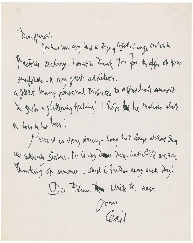ALS signed “Cecil,” one page, 8 x 10, no date. In part: “I want to thank you for the offer of your snapshots—a very great addition. A great many personal tributes to Alfred Lunt amount to such a glittering feeling! I hope he realizes what a loss he is!” In fine condition, with intersecting folds, light scattered creases, and light soiling and an erased pencil notation to the upper border.