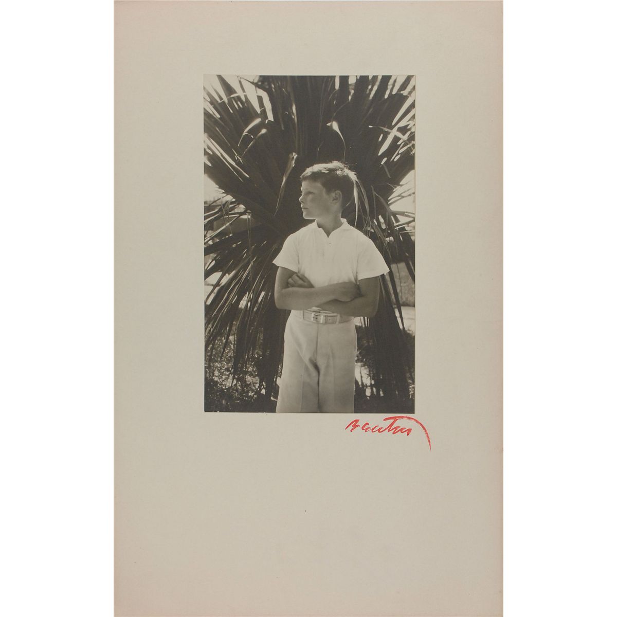 Vintage matte-finish 7.5 x 12 photo of a young boy posing outdoors, affixed to a 14 x 22 mount, signed on the mount in red ink, “Beaton.” In fine condition.