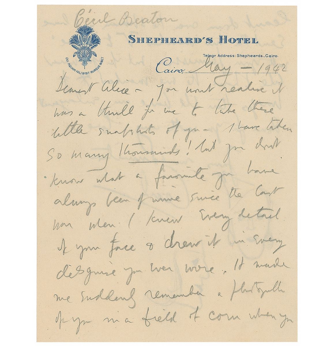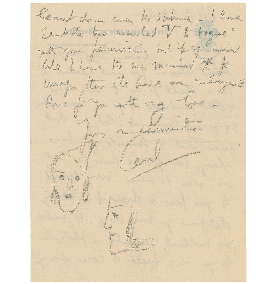 ALS in pencil, signed “Cecil,” one page both sides, 5.75 x 7.5, Shepheard’s Hotel letterhead, May 1942. Letter to Alice, in part: “You won’t realize it was a thrill for me to take these little snapshots of you. I have taken so many thousands! But you don’t know what a favorite you have always been of mine…when I knew every detail of your face & drew it in every disguise you ever wore. It made me suddenly remember a photograph of you in a field of corn…I have sent the two marked V to ‘Vogue.’” Beaton has added two sketches of a female face below his signature. In fine condition, with central horizontal and vertical folds (both passing through small portions of the signature), and some light creasing. The first original art we have seen from the award-winning photographer.
