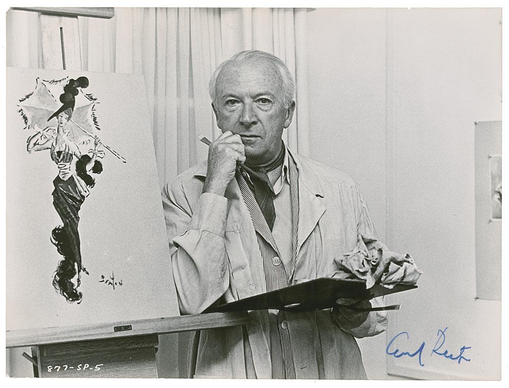 Vintage glossy 9.5 x 7.5 photo of Beaton posing in his artist’s smock alongside one of his works, signed in blue ink. In very good condition, with lightly trimmed edges and scattered creases and surface impressions.