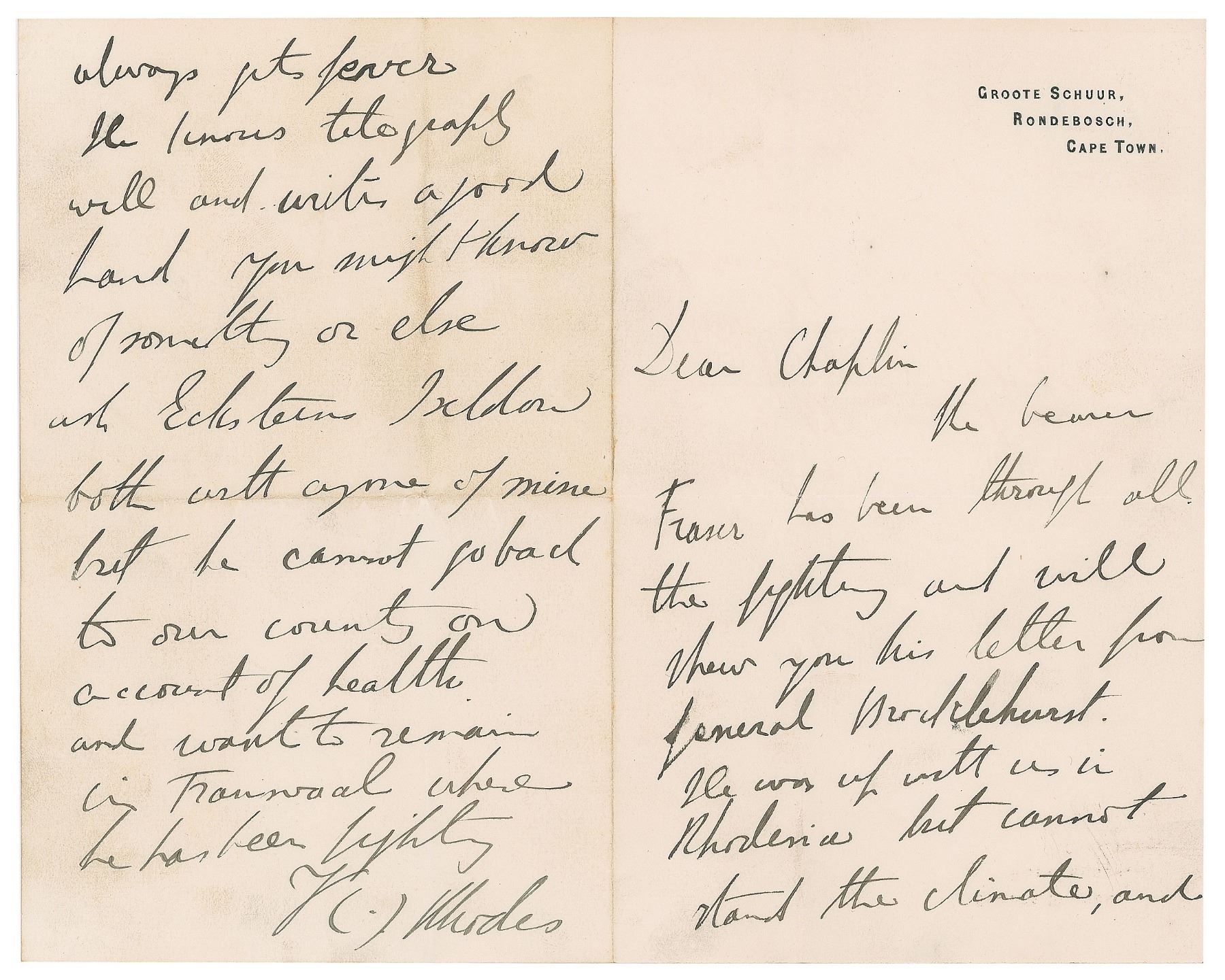 British businessman, mining magnate, and politician in southern Africa (1853–1902) who served as Prime Minister of the Cape Colony from 1890 to 1896. A proponent of British imperialism, recent critics have characterized him as an architect of apartheid. ALS signed “C. J. Rhodes,” two pages on two adjoining sheets, 5 x 8, Groote Schuur letterhead, no date. Letter to "Chaplin," in full: "The bearer Fraser has been though all the fighting and will show you his letter from General Brocklehurst. He was up with us in Rhodesia but cannot stand the climate, and always gets fever. He knows telegraphy well and writes a good hand. You might know of something or else Eckstein. I seldom bother with anyone of mine but he cannot go back to our country on account of health, and wants to remain in Transvaal where he has been fighting." In fine condition, with intersecting folds and light handling wear.