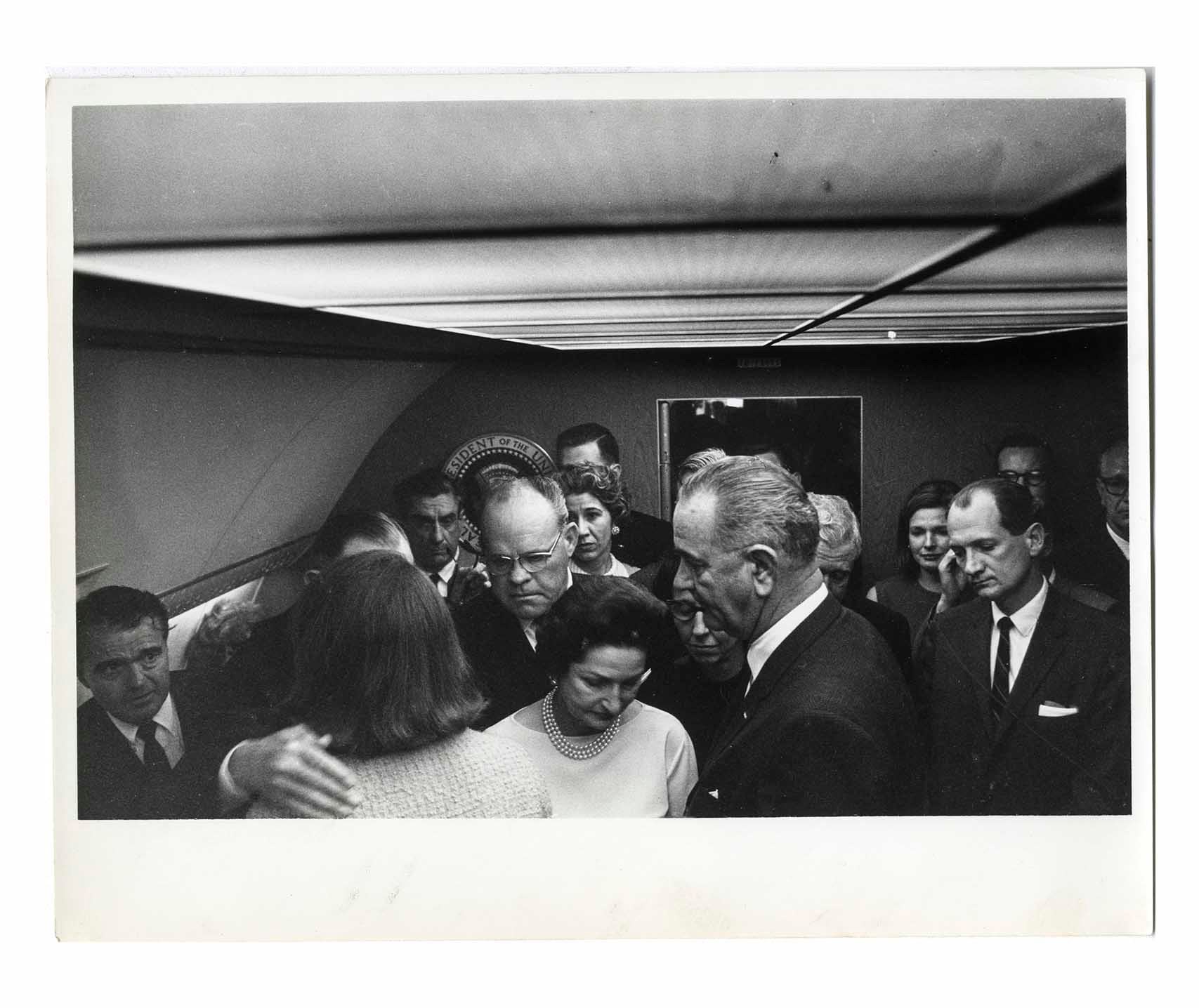 Silver gelatin photo belonging to John F. Kennedy's White House photographer, Cecil W. Stoughton, who captured the iconic photo of Lyndon B. Johnson's inauguration aboard Air Force One after JFK was assassinated. Although Stoughton published only one image from the ceremony, he captured approximately 16 more, of which this is one: following LBJ's swearing-in, Jackie Kennedy is comforted before she left the stateroom aboard AF1. All the people in the room, including LBJ and Lady Bird Johnson, look on with palpable grief. This unpublished photo is from the personal collection of Stoughton, who said that while he was uncomfortable taking the photos, he believed he needed to document it as an important record of history. Glossy photo measures 10'' x 8'', marked ''18'' in red pencil on the verso, and perhaps also initialed by Stoughton on verso. Near fine condition.