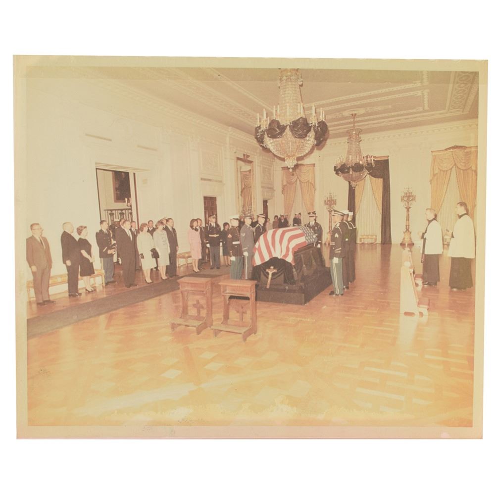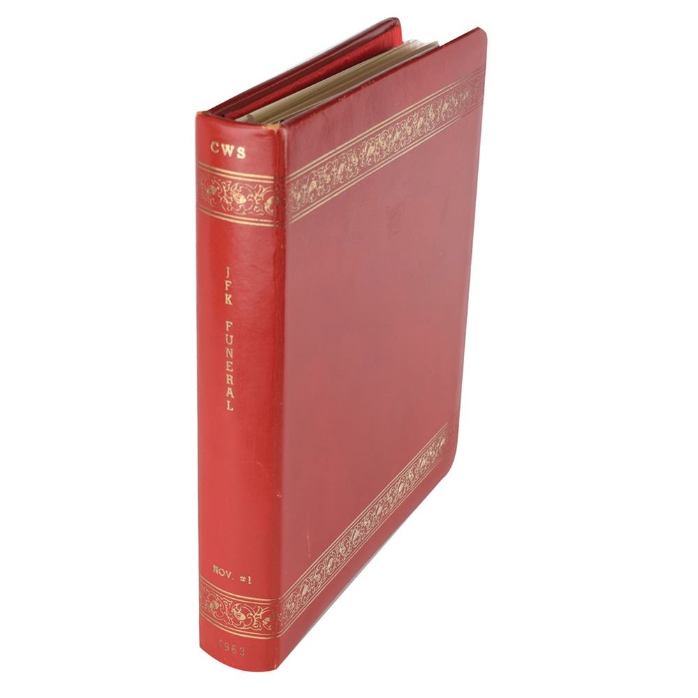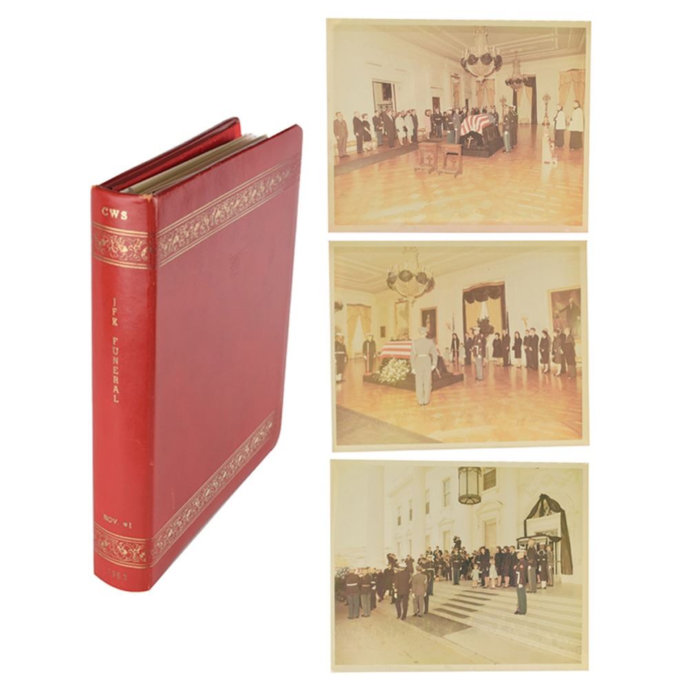 Official White House photographer Cecil Stoughton's personal photo album containing 34 original vintage color 8 x 10 and 10 x 8 photos of the funeral ceremonies of President John F. Kennedy. The red calf leather photo album is stamped with decorative tooling on the front and back, with the spine stamped with Stoughton's initials, "CWS," and a title, "JFK Funeral, Nov. #1, 1963.” A significant collection of 34 large original photos personally owned by Kennedy's White House photographer, Cecil Stoughton, taken on Saturday, November 23rd and Sunday the 24th, which consists primarily of events preceding the State Funeral, with images focusing on Kennedy’s casket in the White House East Room and his eventual transferal by horse-drawn caisson to the Capitol Rotunda.