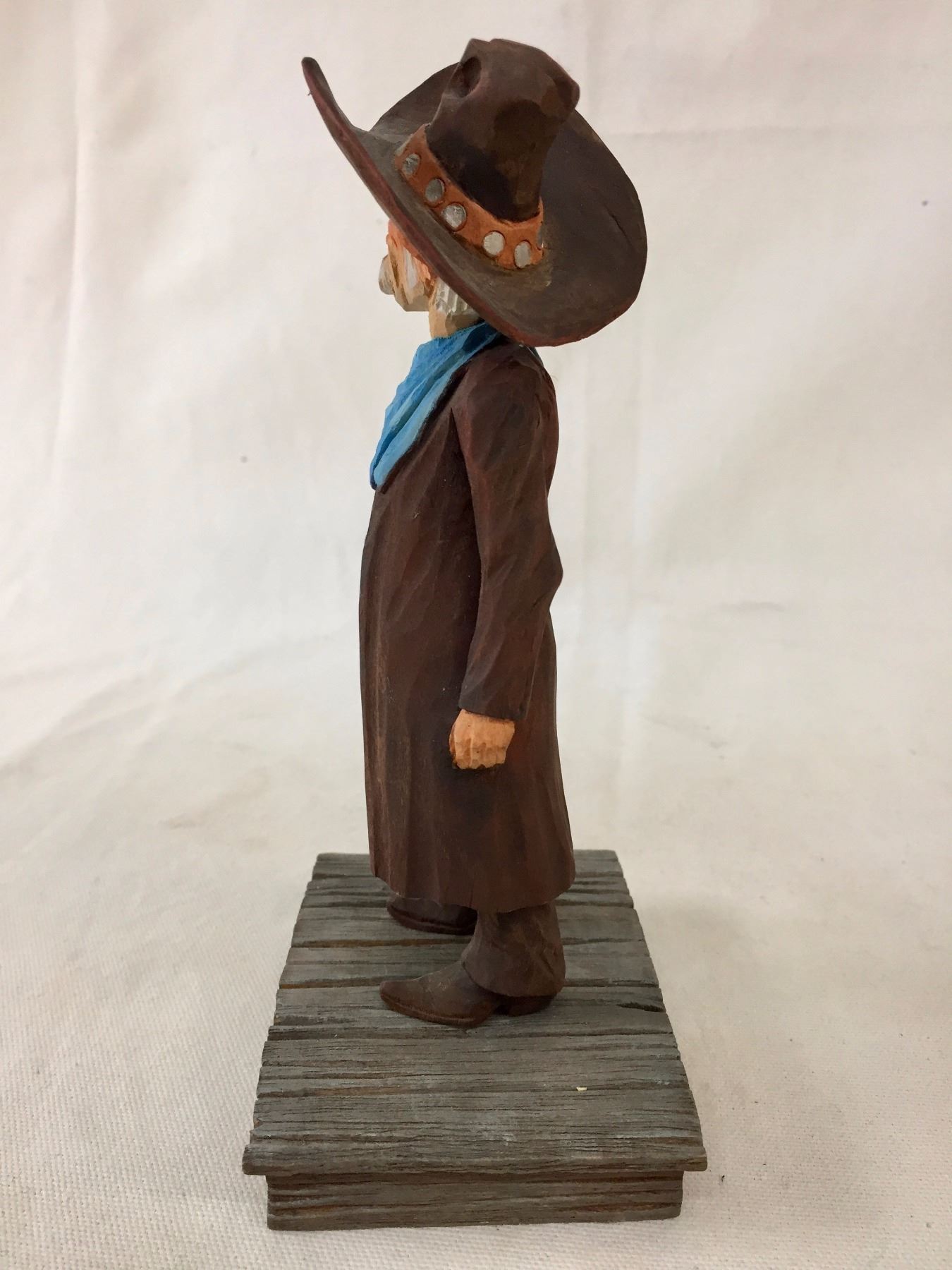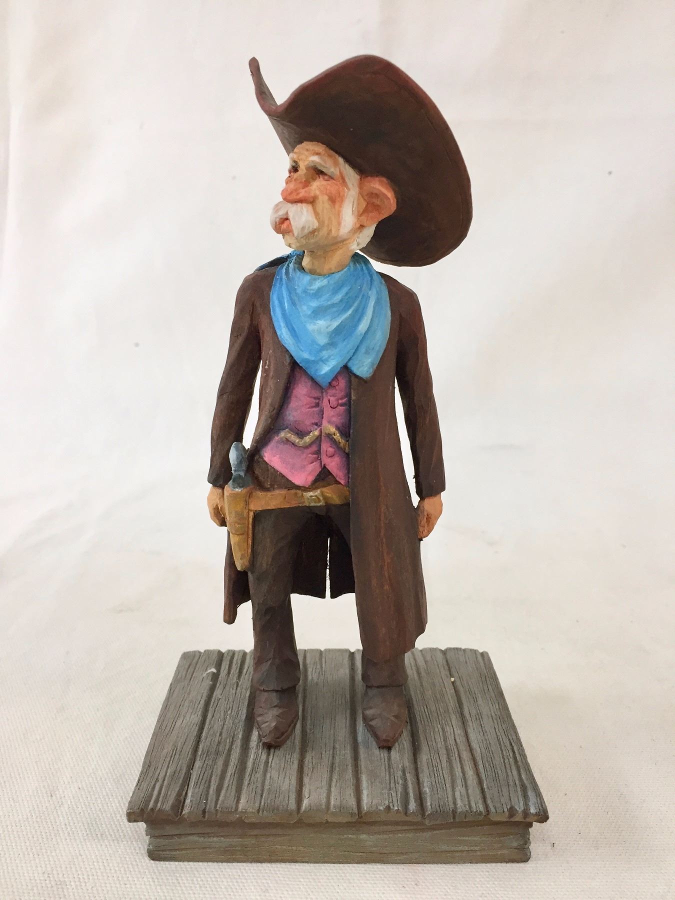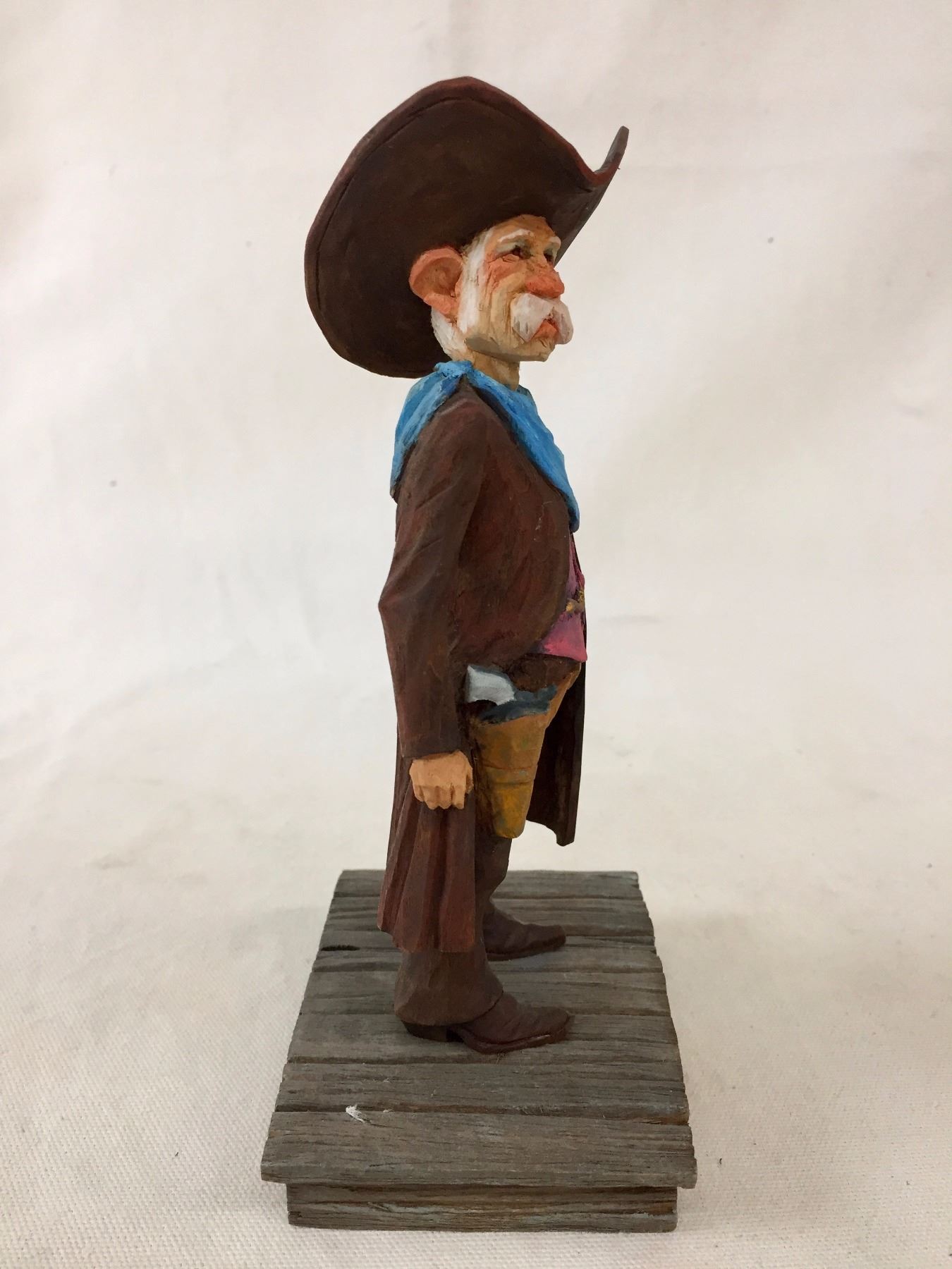 Description: Detailed wood carving of a cowboy with a gun created by Cecil Wakefield. Maker: Cecil Wakefield. Approx. Age: 1980s. Size: 3-3/4”w x 7”h. Condition: Good for its age, normal wear expected. Please look closely at the pictures - they are an important part of our description. Shipping: There will be a $10 handling / packaging fee for shipping this lot. The actual cost of postage will be added on top of that.