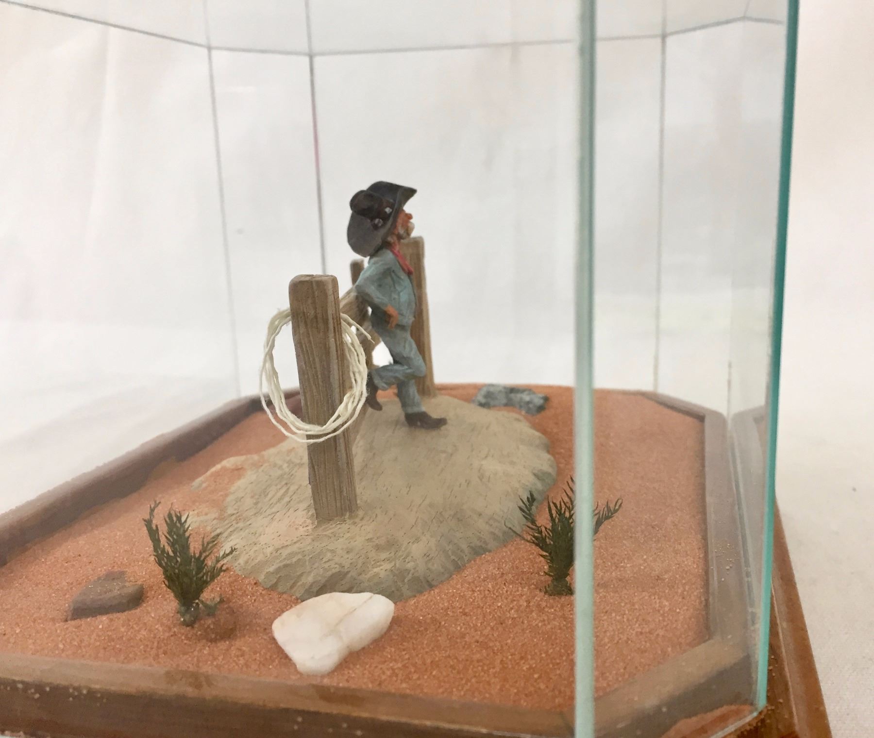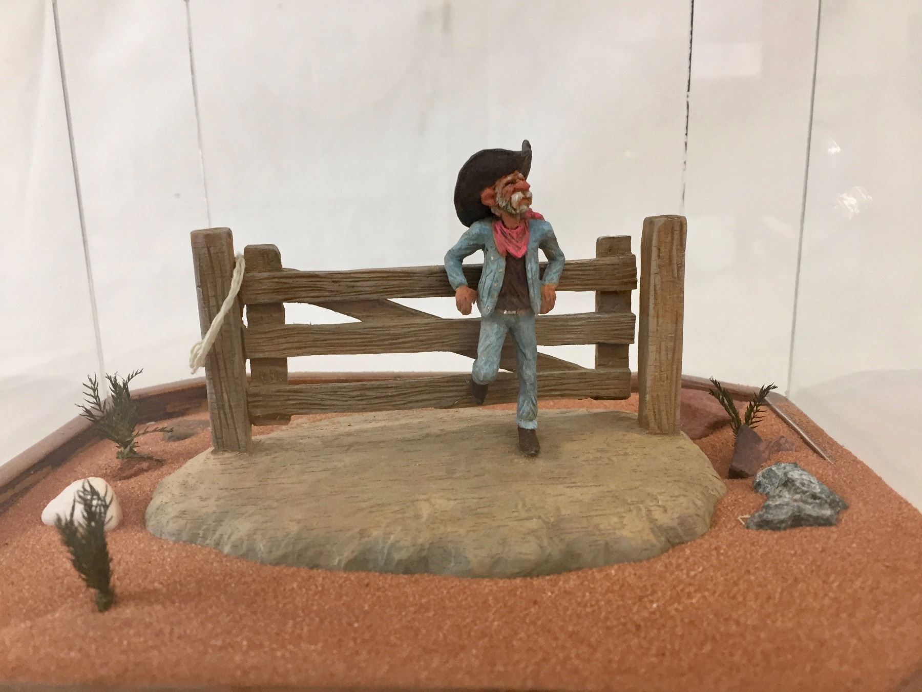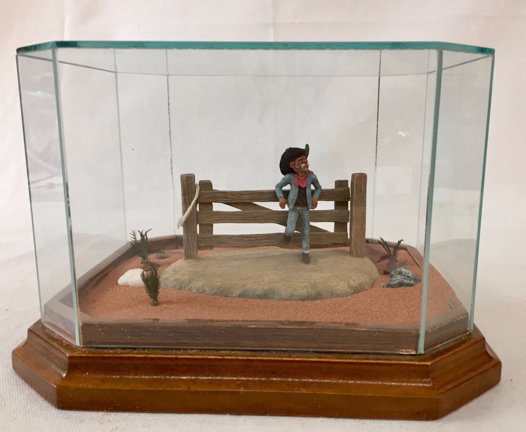 Description: Detailed wood carving of a cowboy leaning against a fence in a desert scene, created by award winning artist Cecil Wakefield. This piece won a couple of ribbons and they are included along with a picture of the artist with the piece. Maker: Cecil Wakefield. Approx. Age: 1970s. Size: 8”w x 5”h. Figure is approx. 3” tall. Condition: Good for its age, normal wear expected. Please look closely at the pictures - they are an important part of our description. Shipping: There will be a $10 handling / packaging fee for shipping this lot. The actual cost of postage will be added on top of that.
