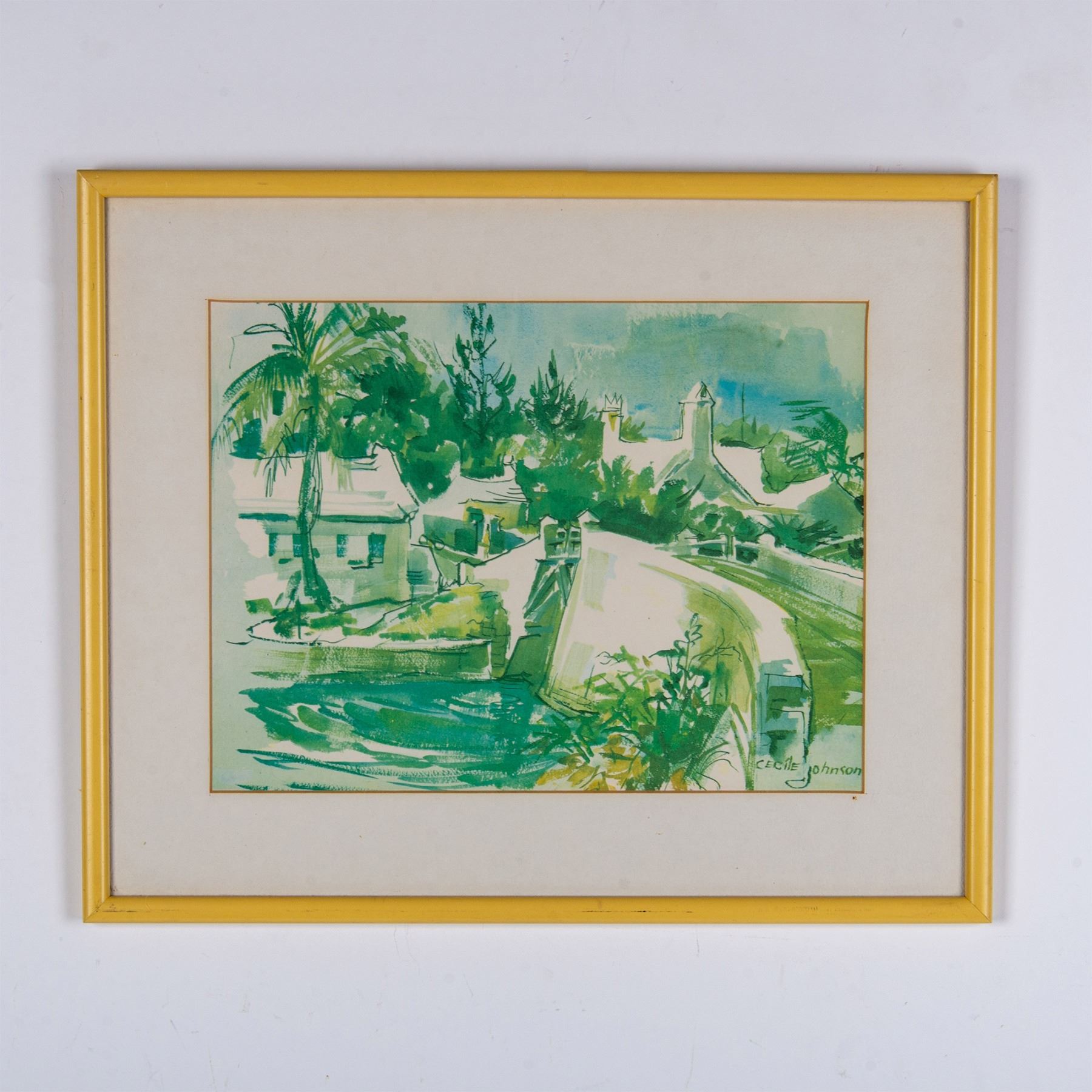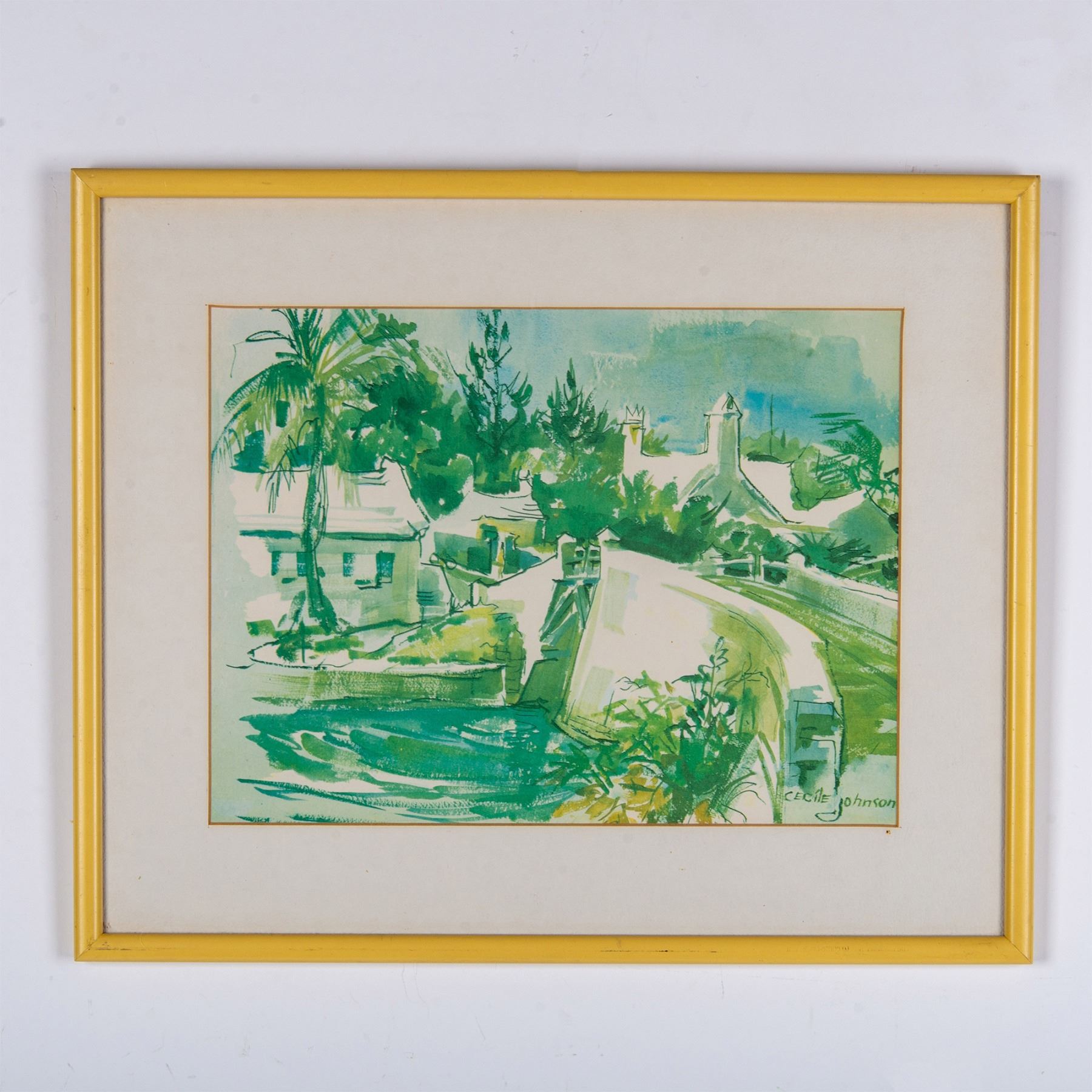Vintage offset watercolor on paper of a tropical landscape after American Plein Air artist Cecile Johnson's original. Signature in plate on lower right: Cecile Johnson. Housed in a cream color wooden frame with a white mat. Sight size: 12"L x 9"H. Frame dimensions: 16.50"L x 13.50"H x 0.75"W. Artwork can be unframed and rolled for shipment.