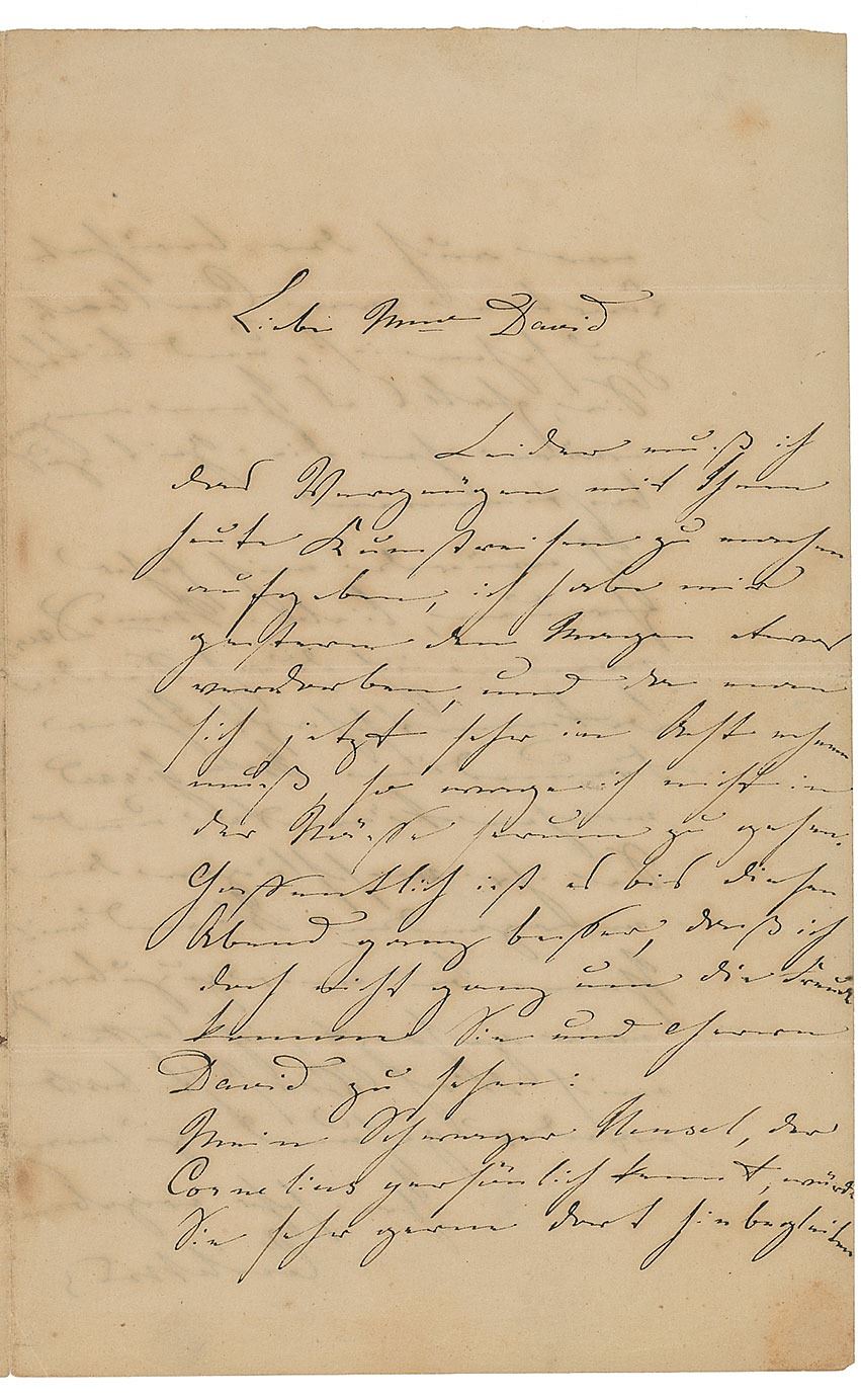 Wife (1817–1853) of composer Felix Mendelssohn-Bartholdy, and mother of historian Carl Mendelssohn-Bartholdy and chemist Paul Mendelssohn-Bartholdy. ALS in German, signed “Cecile M-B,” one page both sides, 5.5 x 9, no date. Letter to Sophie von Liphardt, wife of Ferdinand David, a friend of her husband's youth. She notes that she had to cancel an art trip because she "spoiled her stomach," noting (translated): "Hopefully it will be better until this evening, that I'm not quite happy to see you and Mr. David: my brother-in-law Hanschel, who knows Cornelius [the painter Peter von Cornelius, teacher of Wilhelm von Kaulbach] personally, would very much like to accompany you to where the famous carton of Caulbach [sic] can be seen and asks If you would like to set the time for him. I would be very happy…if I could make the acquaintance of your friend Mme Girard through you, and you suggest to spend the morning with you with me, as I said, I hope to be cured soon with care." In very good to fine condition, with some light staining, and writing showing through from opposing sides.