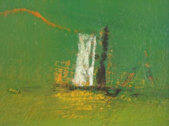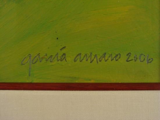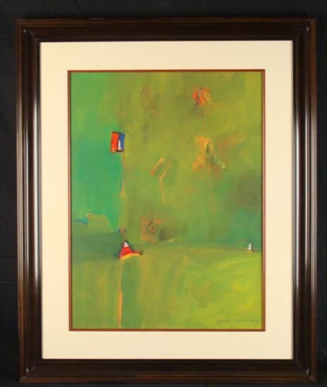 This is a large, original artwork by artist Cecilia Garcia Amaro. It is an abstract image of a banjo, on a green background. The sparse imagery and use of space adds a dynamic rhythm to the work. Artist: Cecilia Garcia Amaro Title: "Mareat del Bajo" Medium: Original acyrlic and pastels on paper Signature: Hand signed and dated by the artist in pastel, lower right Date: 2006 Image size: 22 x 30 inches Frame size: 33 x 40 1/2 inches Framing: Custom framed, with natural canvas matte and inner wood border, in dark brown wood frame Condition: Excellent Certificate of Authenticity: Included This is an engaging abstract original by the well respected Amaro. Cecilia Garcia Amaro (1953- ) was born in Guadalajara, Mexico. She began her artistic studies in the field of interior design at the Superior Institute of Art and Culture. In most of her visual art, she is self taught. She moved to California in 1980, and began exhibiting with artist collectives. Her work was eventually featured in shows at the Museum Amparo, the Art Center in Norfolk Virginia, the Mexican Embassy in Los Angeles, California, and the Mexican Embassy San Diego. Amaro's inspiration comes from her native land of Mexico. This can be seen in her expressive lines and abstraction. Her work is often compared to Mexican master artists such as Orozco, Rivera, and Tamayo. Today she Amaro is one of Mexico s leading contemporary artists, and her art can be found in many public and private collections. *