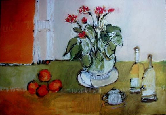 Flowers, fruit, bottles, and a porcelain sugar jar make up this pleasant still life art print. * Artist: Cecilia Garcia AmaroTitle: "Porcelana de Azucar"Signature: Signed by the artistEdition: LimitedMedium: Giclee on Arches paper with deckled edgesSize: 30-3/4 " x 43-3/4"Condition: ExcellentBiography: * Cecilia Garcia Amaro was born in 1953, in the City of Guadalajara. She studied Interior Design at the Superior Institute of Art and Culture in Monterrey, California.Cecilia, who is also a singer, composer and musician, held her first exhibition in the Disarte Gallery in Tijuana, Baja, California and performed her song entitled "Canto Sobre Papel" ....."Song Over the Paper".During the last several years, Cecilia has combined her exhibitions with musical presentations where her inspiring poetry can be best expressed through her musical interpretations. Ms. Amaro can count more than sixty exhibitions.Cecilia's art captures the warmth and feeling of her beloved native land, Mexico. Ms. Amaro, while continuing to hold concerts and exhibitions on a regular basis, far exceeding the norm of most artists, has now become a beloved icon, who expresses a warm, beautiful, creative and generous spirit of the Mexican peoples. Her art along with her music transcends all geographical boundaries worldwide. * Cecilia Garcia Amaro's art is now among the collection of the 3 great Mexican muralists - Rivera, Siqueiros and Orozco. Not to mention that her pieces are surrounded by Tomayo, Toledo, Lazo, Nishizawa and several other prominent artists of Mexico. This elite collection is in Mexico' City's Industrial's Club - now 47 years old. The oldest piece - a Pelegrin Clave - dates back to 1849, and the most recent - a Cecilia Garcia Amaro, 1996. Timeline of one and a half centuries. *