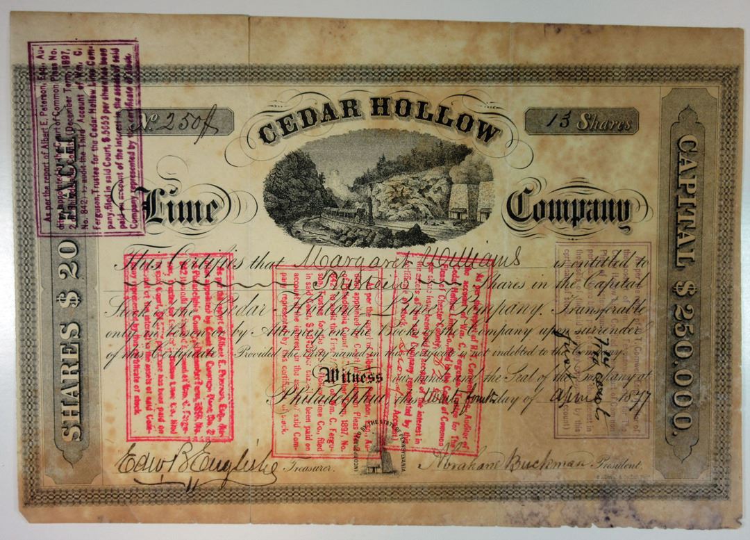 Philadelphia, Pennsylvania, 1877. 13 Shares Issued and partially redeemed Capital Stock Certificate, Black text with black border, Train passing by river at top center. Cancelled stamps throughout, fine condition. Cedar Hollow Lime Company was chartered on January 4, 1856.