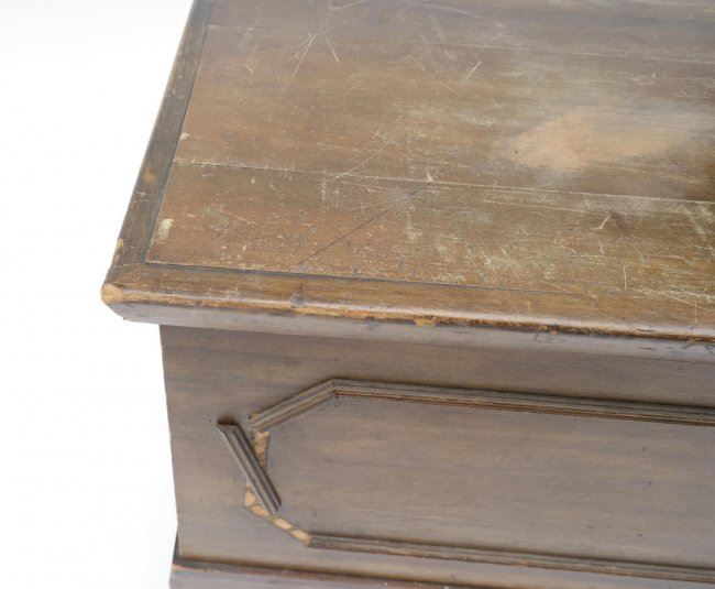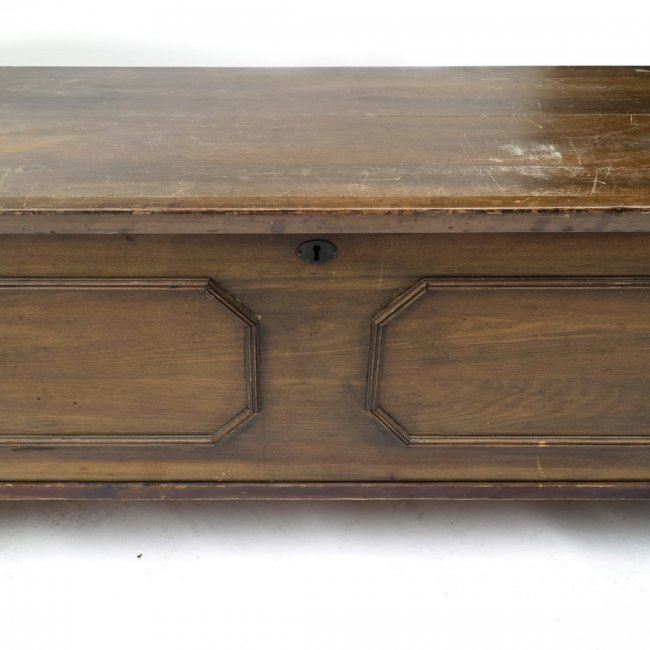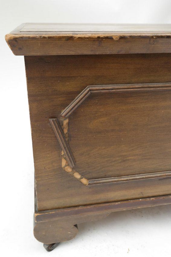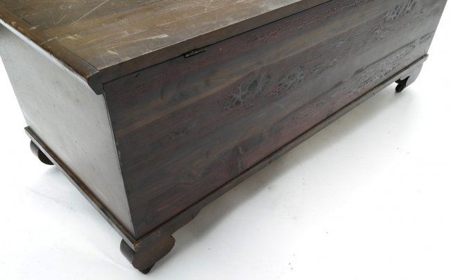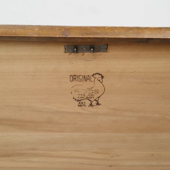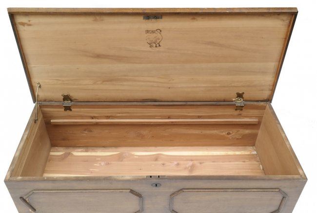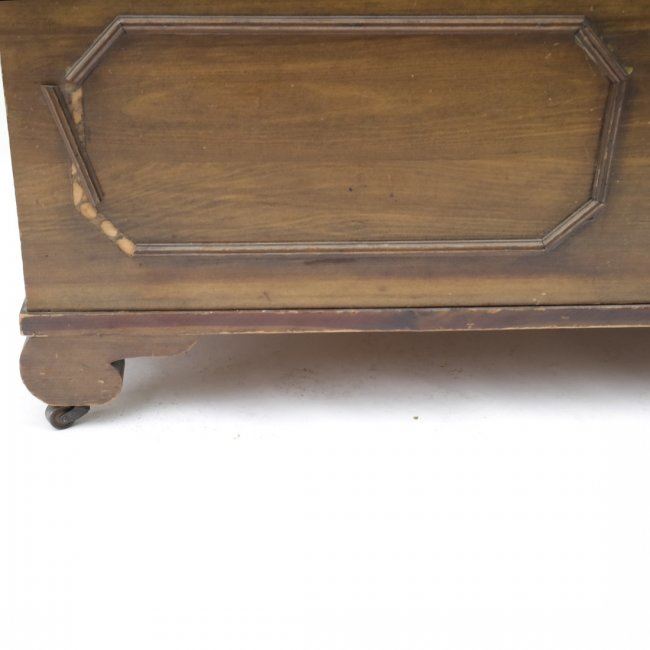 Cedar lined hope chest by "Roos Mfg Company" (1871-1920) bearing original labels and mounted on casters. [45" W x 19" D x 17" H]. Top heavily scratched, left side hinge needs reattaching.