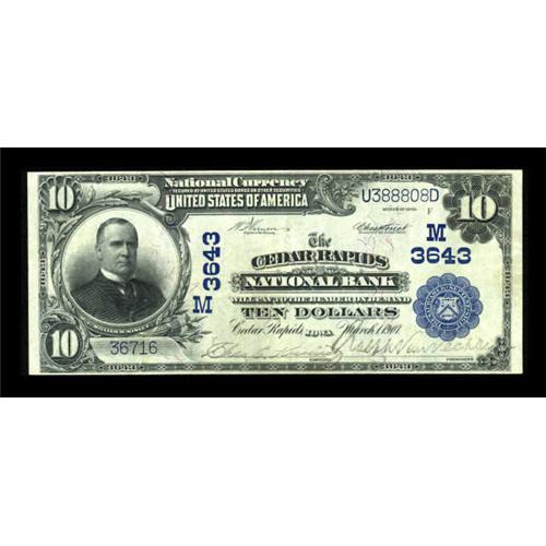 <B>Cedar Rapids, IA</B></I> - $10 1902 Plain Back Fr. 626 <B>The Cedar Rapids NB</B></I> Ch. # (M)3643<BR> A high grade example which appears new at first glance. <B>Extremely Fine.</B></I><BR><BR><b>Shipping:</b> Coins & Currency (<a target="_blank" href="http://www.heritageauctions.com/common/shipping.php">view shipping information</a>)