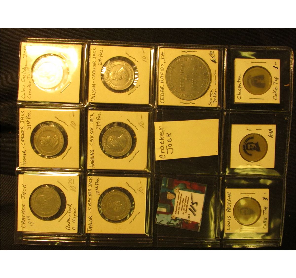 Cedar Rapids, Ia. "Scotch Dollar"; (6) Different Cracker Jack Presidential Medal Coins & (3) Coke Tops depicting "Louis Pasteur", "Booker T. Washington", & "Cleopatra".
