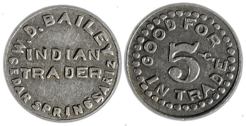 Obverse: W.D. Bailey / indian / trader / cedar springs, Ariz. Reverse: Good for / 5c / in trade. AL 19mm. Fine condition. R9. Cedar Springs is Navajo County ghost town.