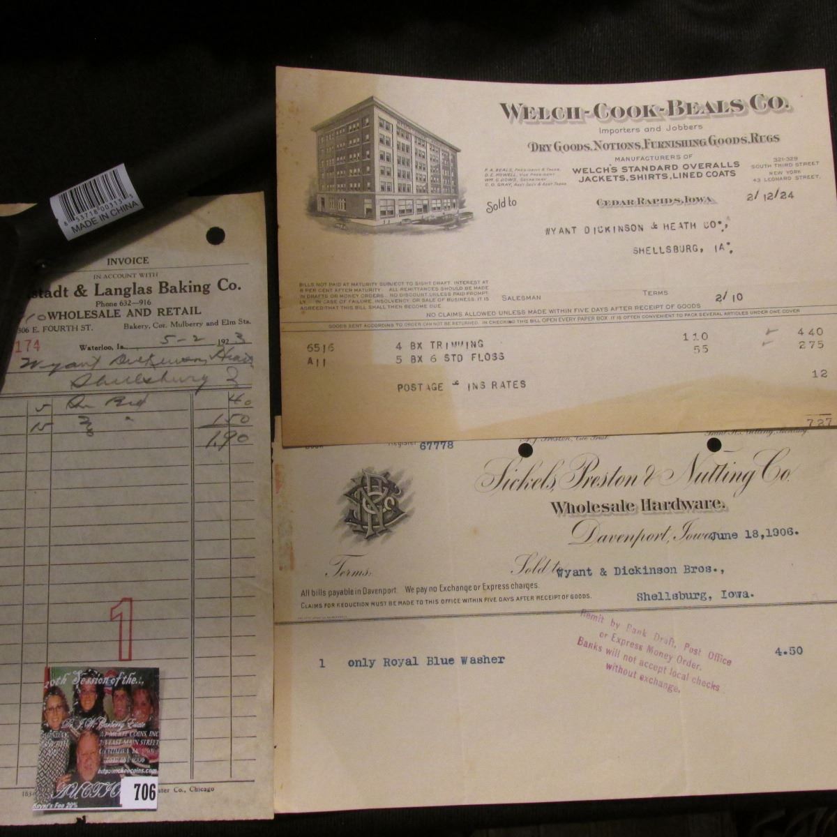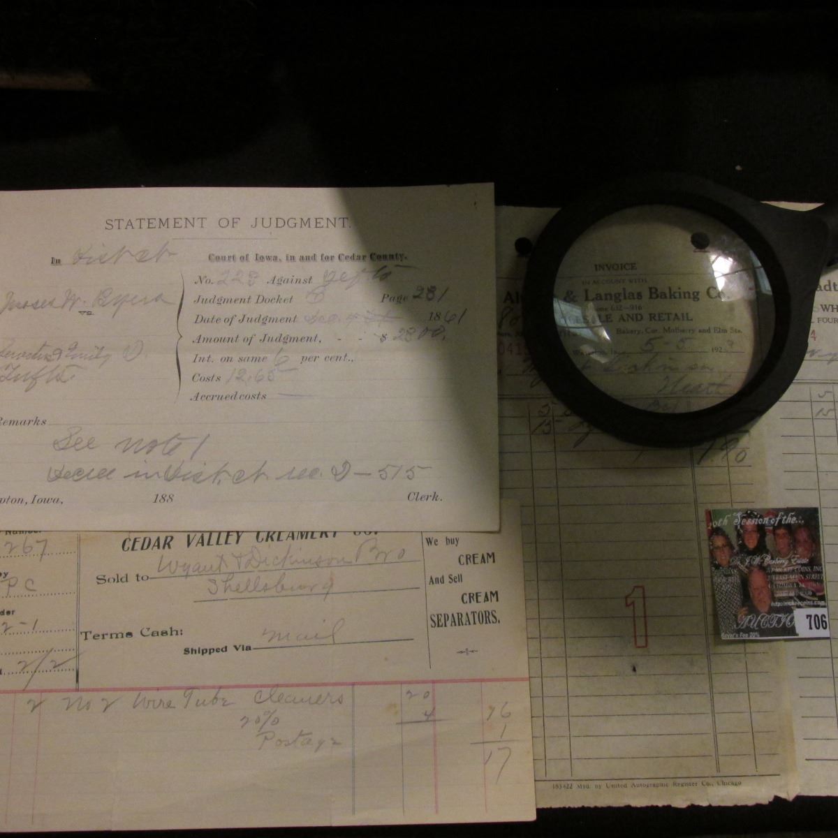 "Cedar Valley Creamery Co. Cedar Rapids, Iowa We buy Cream And Sell Cream Separators."; 1861 Statement of Judgment…Court of Iowa, In and for Cedar County…"; 1924 Cedar Rapids, Ia. invoice "Welch-Cook-Beals Co. Importers and Jobbers"; (2) 1923 invoices "Alstadt & Langlas Baking Co...."; 1906 invoice "Sickels, Preston Nutting Co., Wholesale Hardware Davenport, Iowa"; & a used Magnifying Glass, battery compartment lid missing.