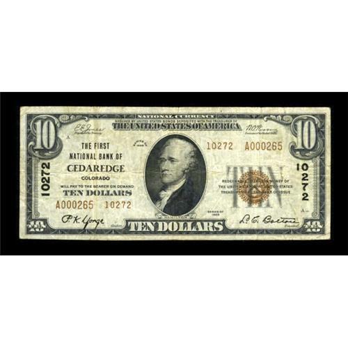 <B>Cedaredge, CO</B></I> - $10 1929 Ty. 2 <B>The First NB</B></I> Ch. # 10272<BR> This was the only bank to issue in this small Delta County location, with both large and small notes in short supply. With the exception of the one known uncut sheet from here, this note is the only Type 2 $10 recorded to date. Nice <B>Fine+++.</B></I><BR><BR><b>Shipping:</b> Coins & Currency (<a target="_blank" href="http://www.heritageauctions.com/common/shipping.php">view shipping information</a>)