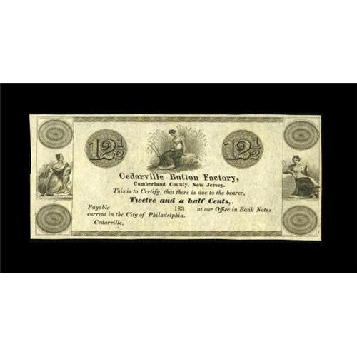 <B>Cedarville, NJ- Cedarville Button Factory</B></I> 12 1/2¢ Wait 388<BR> An unsigned remainder from this circa-1830's south Jersey issuer. <B>Uncirculated.</B></I><BR><I>From The Collection of a Louisiana Gentleman.</B></I><BR><BR><b>Shipping:</b> Coins & Currency (<a target="_blank" href="http://www.heritageauctions.com/common/shipping.php">view shipping information</a>)
