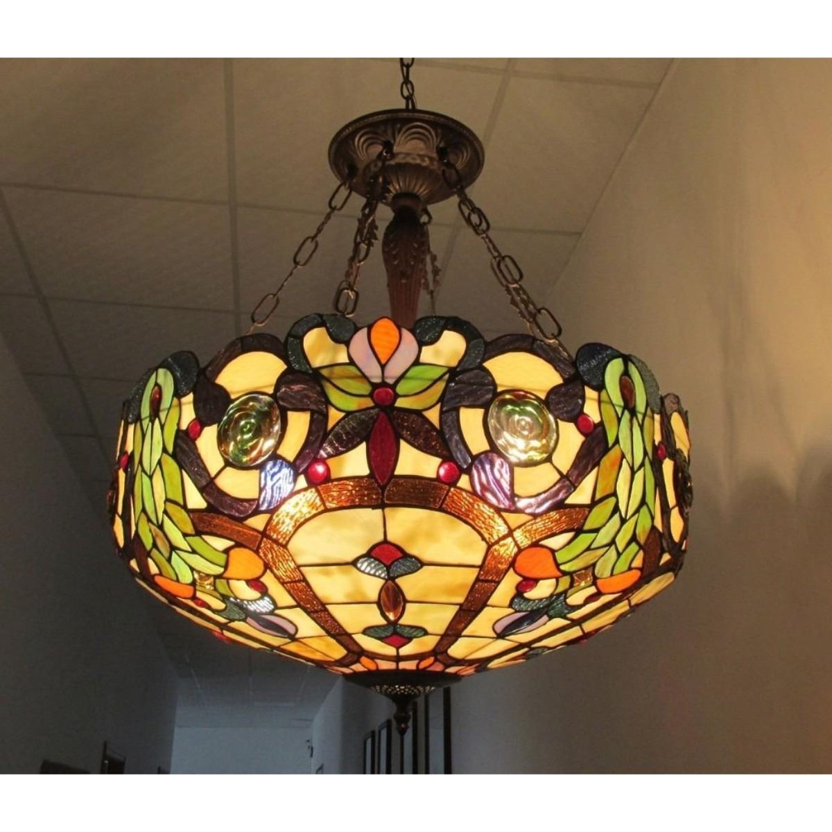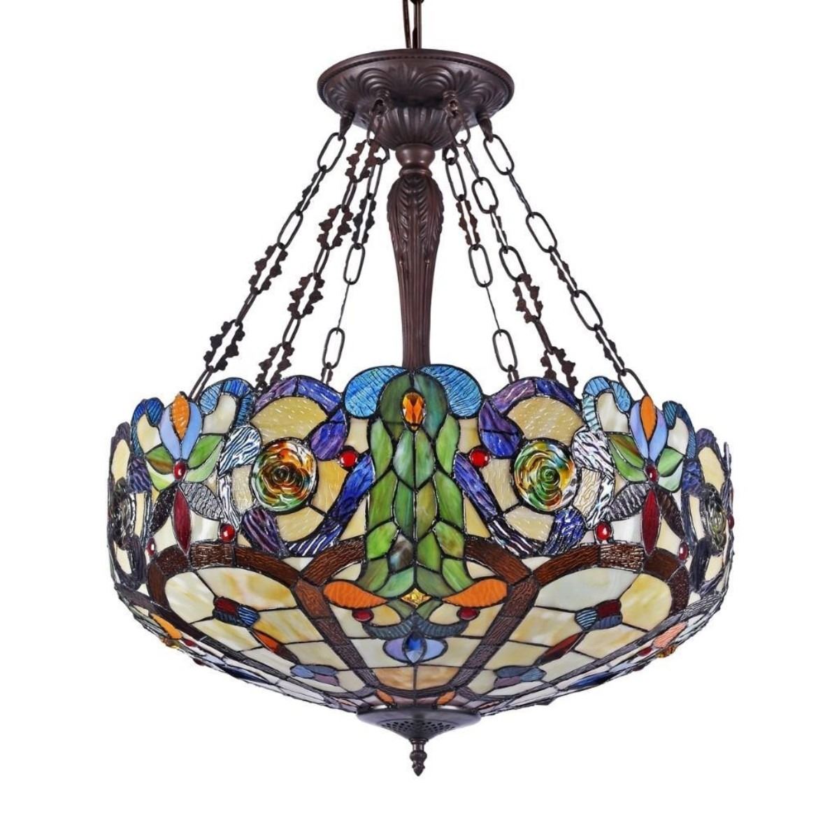HALINA Tiffany-style 4 Light Inverted Ceiling Pendant 24" Shade HALINA, a magnificent stained-glass ceiling pendant. The exquisite craftsmanship makes this an ideal accent for your entryway. The shade is made of hand-cut pieces of colorful stained Tiffany glass for exceptional style. Glass TypeTiffany-glass Net Weight (lbs)18.96 Overall Length (in)24.00 Overall Width (in)24.00 Overall Height (in)28.67 Max Hanging Distance (in)88.00 Shade Width (in)24.00 Shade Height (in)24.00 Mid-Stem(s) Height (in)17.1 Mid-Stem MaterialsMetal; Poly-resin Ceiling Chain, Stem, Wire Length (in)60 Electric Wire Length (in)73 Threaded Pipe/Finial Length (in)7.09 Threaded Pipe/Finial Material Metal Canopy Materials Metal Light Bulb Types(4) 100 Watt max E26 Type A Bulb (not included) Switch Type Hardwired Est. Glass Cuts 512 Est. Glass Beads 40 Light Direction Uplight Specific Uses Indoor Finish Dark Antique Bronze Overall Materials Glass, resin, metal & electrical components Glass Thickness (in)0.12 Shade Shape Round Â