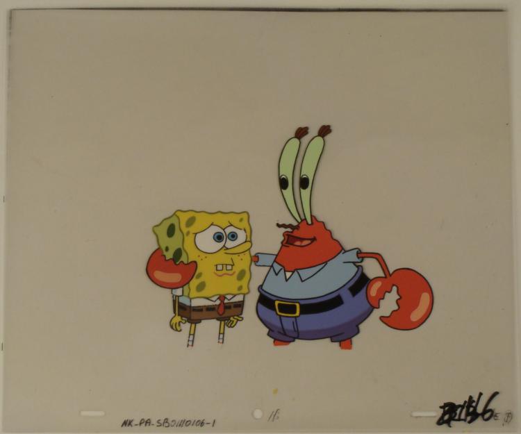 This animation cel is from the Nickelodeon TV show SpongeBob Squarepants. The story takes place under the deep blue sea in Bikini Bottom, where SpongeBob resides. SpongeBob, who is a yellow, porous sponge, is your typical happy-go-lucky character, as he is always cheerful and enjoys making people laugh. Patrick Star, SpongeBob's neighbor who is a starfish, is your average children's show idiot, as he boasts knowing nothing and is often getting himself into ridiculous situations. Between the homes of these two lies the home of the miserable Squidward, a squid, who is known for being grouchy and playing tricks on SpongeBob and Patrick. Both SpongeBob and Squidward work at the Krusty Krab, a fast food business run by the greedy money-loving Mr. Krabs, a crab, the arch rival of the evil, possibly misunderstood, Plankton. Another neighbor, Sandy Cheeks, an athletic squirrel who normally wears an astronaut's space suit, was introduced in "Tea at the Treedome." She spends most of her time inventing and experimenting. * Mr. Krabs is giving SpongeBob advice * Original Animation Cel Overall Size of the Cel: 10 1/2" x 12 1/2" Very good condition This is an original hand-painted cel set-up used in the production of an episode of "SpongeBob SquarePants." Each one-of-a-kind set-up represents a slight change in position of the characters. When individually photographed and projected in rapid succession, the images appear to move. * To create production cels, the original animator's drawing is transferred onto an acetate cel (by hand-inking and/or photo copying). The cel is then hand-painted on the reverse side. * The notations are located at the bottom of both. The cel is multi-layered: first is SpongeBob's eyes and the second cel is SpongeBob's body and the third cel is Mr. Krabs. *