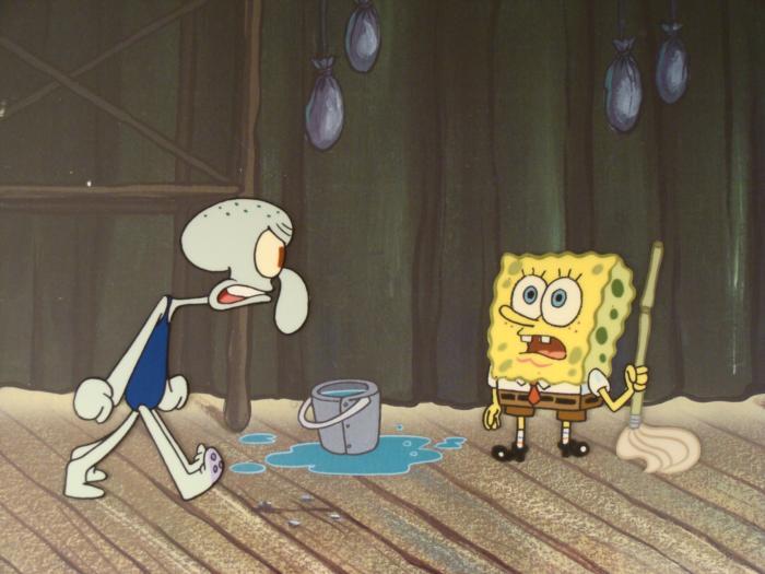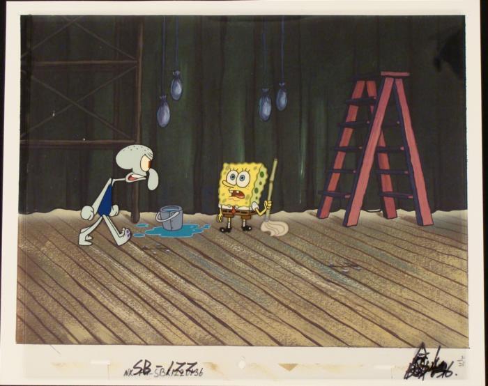 This animation cel and reproduction background are from the Nickelodeon TV show SpongeBob Squarepants. The story takes place under the deep blue sea in Bikini Bottom, where SpongeBob resides. SpongeBob, who is a yellow, porous sponge, is your typical happy-go-lucky character, as he is always cheerful and enjoys making people laugh. Patrick Star, SpongeBob's neighbor who is a starfish, is your average children's show idiot, as he boasts knowing nothing and is often getting himself into ridiculous situations. Between the homes of these two lies the home of the miserable Squidward, a squid, who is known for being grouchy and playing tricks on SpongeBob and Patrick. Both SpongeBob and Squidward work at the Krusty Krab, a fast food business run by the greedy money-loving Mr. Krabs, a crab, the arch rival of the evil, possibly misunderstood, Plankton. Another neighbor, Sandy Cheeks, an athletic squirrel who normally wears an astronaut's space suit, was introduced in "Tea at the Treedome." She spends most of her time inventing and experimenting. Squidward looks angry at SpongeBob.Original Printed Background and Animated Cel Overall Size of Background: 11" x 13 1/2" Overall Size of the Cel: 10 1/2" x 12 1/2" Very good condition This is an original hand-painted cel set-up used in the production of an episode of "SpongeBob SquarePants." Each one-of-a-kind set-up represents a slight change in position of the characters. When individually photographed and projected in rapid succession, the images appear to move.