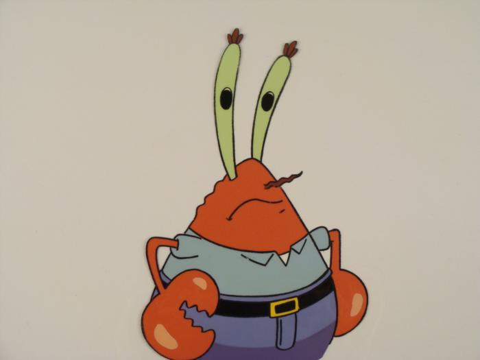 This original animation cel is from the Nickelodeon TV show SpongeBob Squarepants. The story takes place under the deep blue sea in Bikini Bottom, where SpongeBob resides. SpongeBob, who is a yellow, porous sponge, is your typical happy-go-lucky character, as he is always cheerful and enjoys making people laugh. Patrick Star, SpongeBob's neighbor who is a starfish, is your average children's show idiot, as he boasts knowing nothing and is often getting himself into ridiculous situations. Between the homes of these two lies the home of the miserable Squidward, a squid, who is known for being grouchy and playing tricks on SpongeBob and Patrick. Both SpongeBob and Squidward work at the Krusty Krab, a fast food business run by the greedy money-loving Mr. Krabs, a crab, the arch rival of the evil, possibly misunderstood, Plankton. Another neighbor, Sandy Cheeks, an athletic squirrel who normally wears an astronaut's space suit, was introduced in "Tea at the Treedome." She spends most of her time inventing and experimenting. Depicted in this cel Mr. Krabs means nothing but business; don't test him.Original Production Animated Cel Overall Size of Cel: 10 1/2" x 12 1/2" Excellent ConditionThis is an original hand-painted cel set-up used in the production of an episode of "SpongeBob SquarePants." Each one-of-a-kind set-up represents a slight change in position of the characters. When individually photographed and projected in rapid succession, the images appear to move.