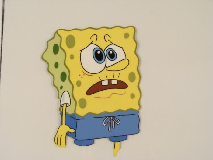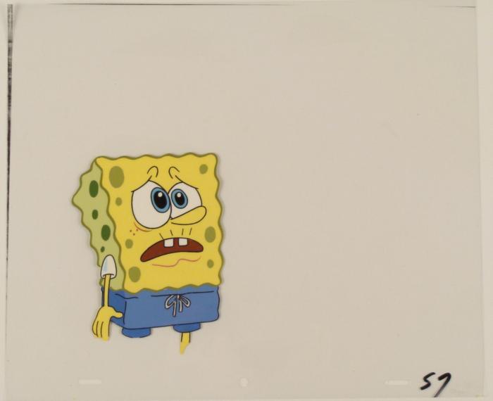 This original animation cel is from the Nickelodeon TV show SpongeBob Squarepants. The story takes place under the deep blue sea in Bikini Bottom, where SpongeBob resides. SpongeBob, who is a yellow, porous sponge, is your typical happy-go-lucky character, as he is always cheerful and enjoys making people laugh. Patrick Star, SpongeBob's neighbor who is a starfish, is your average children's show idiot, as he boasts knowing nothing and is often getting himself into ridiculous situations. Between the homes of these two lies the home of the miserable Squidward, a squid, who is known for being grouchy and playing tricks on SpongeBob and Patrick. Both SpongeBob and Squidward work at the Krusty Krab, a fast food business run by the greedy money-loving Mr. Krabs, a crab, the arch rival of the evil, possibly misunderstood, Plankton. Another neighbor, Sandy Cheeks, an athletic squirrel who normally wears an astronaut's space suit, was introduced in "Tea at the Treedome." She spends most of her time inventing and experimenting. SpongeBob appears to be feeling down.Original Production Animated Cel Overall Size of Cel: 10 1/2" x 12 1/2" Very Good ConditionThis is an original hand-painted cel set-up used in the production of an episode of "SpongeBob SquarePants." Each one-of-a-kind set-up represents a slight change in position of the characters. When individually photographed and projected in rapid succession, the images appear to move.