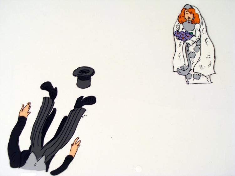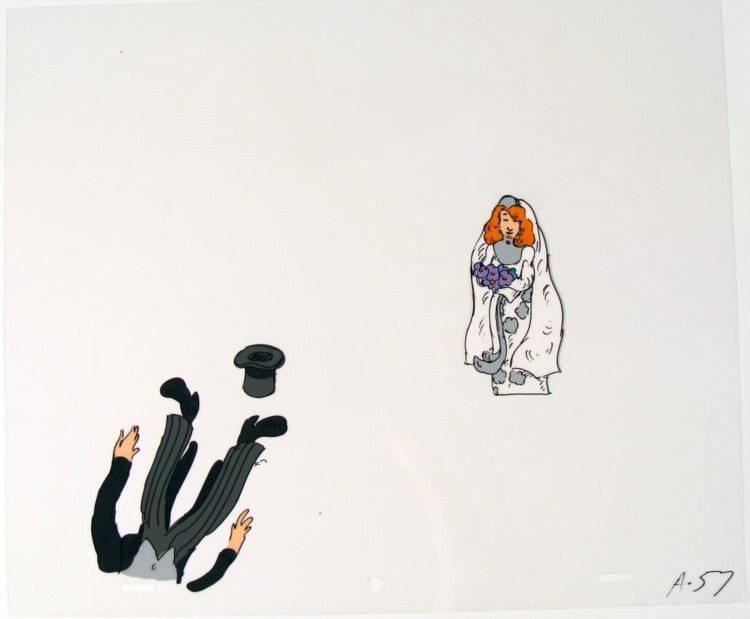 This is an original animation cel of a bride and groom. WOW, I never realized how good that was going to feel... Medium: Hand painted acetate cel Cel size: 10 1/2" x 12 1/2" Notations: Bottom of cel Condition: Excellent