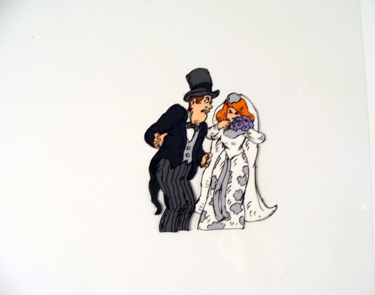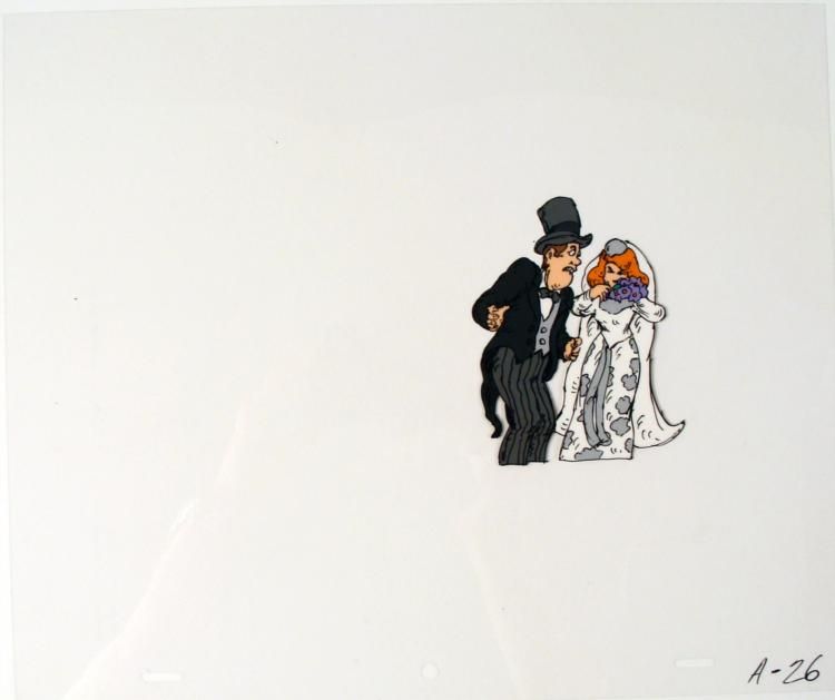 This is an original animation cel of a bride and groom. * * * * You are absolutely unbelievable!!! How do dare you contradict me!! * * * Medium: Hand painted acetate cel * * Cel size: 10 1/2" x 12 1/2" * * Notations: Bottom of cel * * Condition: Excellent