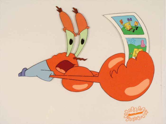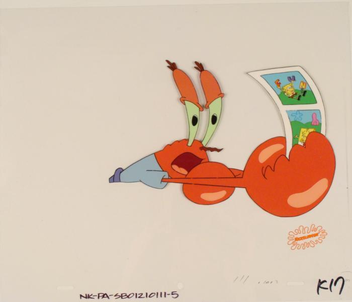 This original animation cel is from the Nickelodeon TV show SpongeBob Squarepants. The story takes place under the deep blue sea in Bikini Bottom, where SpongeBob resides. SpongeBob, who is a yellow, porous sponge, is your typical happy-go-lucky character, as he is always cheerful and enjoys making people laugh. Patrick Star, SpongeBob's neighbor who is a starfish, is your average children's show idiot, as he boasts knowing nothing and is often getting himself into ridiculous situations. Between the homes of these two lies the home of the miserable Squidward, a squid, who is known for being grouchy and playing tricks on SpongeBob and Patrick. Both SpongeBob and Squidward work at the Krusty Krab, a fast food business run by the greedy money-loving Mr. Krabs, a crab, the arch rival of the evil, possibly misunderstood, Plankton. Another neighbor, Sandy Cheeks, an athletic squirrel who normally wears an astronaut's space suit, was introduced in "Tea at the Treedome." She spends most of her time inventing and experimenting. It appears that Mr. Krabs can't believe what he saw in these pictures of Spongebob. Original Production Animated CelOverall Size of Cel: 10 1/2" x 12 1/2" Excellent ConditionThis is an original hand-painted cel set-up used in the production of an episode of "SpongeBob SquarePants." Each one-of-a-kind set-up represents a slight change in position of the characters. When individually photographed and projected in rapid succession, the images appear to move.