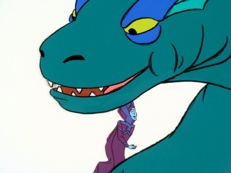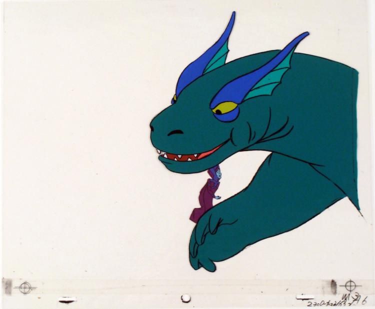 This is an original animation cel of a green dragon and what appears to be alien-looking woman. * * Hmmmmm, dinner time... * * Medium: Hand painted acetate cel * * Cel size: 13 1/2" x 14" * * Condition: ExcellentNotations: Taped to the bottom of cel**The cel received by the winning bidder may be ever so slightly different than that in the auction photo. * *