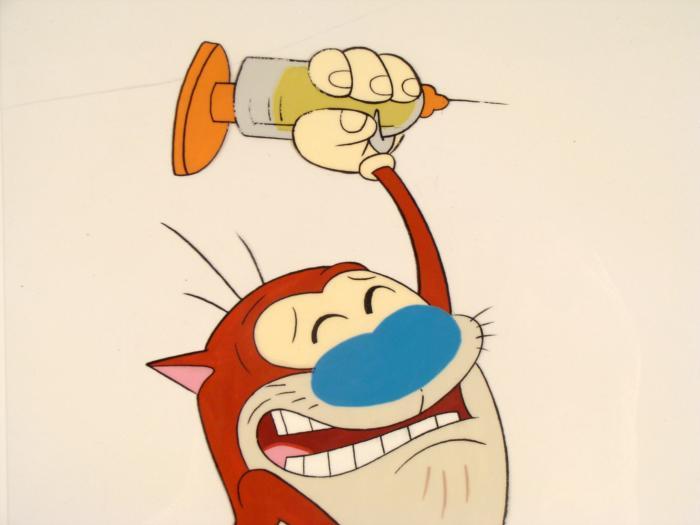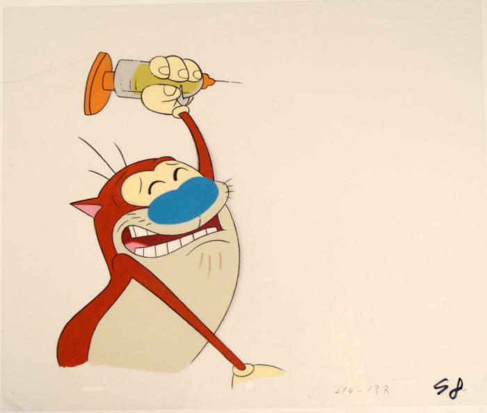 This is an original production animation cel from the Nickelodeon TV show Ren & Stimpy. The show follows two characters - Ren, a crazy Chihuahua - and - Stimpy, an incredibly stupid cat - as they think up to all kinds of hair brained schemes and get themselves into some sticky situations. The Ren and Stimpy Show debuted in August 1991 with a two-part episode, 'Stimpy's Big Day / The Big Shot' and became an instant hit. It was the third Nicktoon ever to be aired on the Network alongside Doug and Rugrats. "Please don't make make me do this, this wasn't apart of our agreement..."Original Production Art Cel Overall Size of the Cel: 10 1/2" x 12 1/2" Excellent condition This is an original hand-painted cel set-up used in the production of an episode of "The Ren & Stimpy Show." Each one-of-a-kind set-up represents a slight change in position of the characters. When individually photographed and projected in rapid succession, the images appear to move.