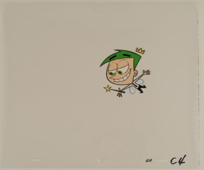 CelThis original hand-painted background from the Nickelodeon TV show Fairly Odd Parents. Timmy Turner is a short, buck-toothed 10-year-old boy with a pink cap who lives in Dimmsdale, a small suburban town with his dim-witted parents. His life is constantly miserable, due to the fact that his parents are rarely home and he is babysat by an incredibly evil teenager, Vicky, and that, generally, no one understands him (as indicated by the show's theme song). But everything changes when he receives two fairy parents: Cosmo and his wife, Wanda and later, their son Poof. Timmy learns that his fairy godparents are capable of granting him any wish he wants within certain limits. However, Timmy's immature nature causes him to sometimes ask for wishes that unintentionally result in disaster, and he and his fairy parents and fairy brother must find a way to "unwish" the wish. Will you look at that, just like magic. Original Production Animated Cel Overall Size of Cel: 10 1/2" x 12 1/2" Very Good ConditionThis is an original hand-painted cel set-up used in the production of an episode of "Fairly Odd Parents." Each one-of-a-kind set-up represents a slight change in position of the characters. When individually photographed and projected in rapid succession, the images appear to move.