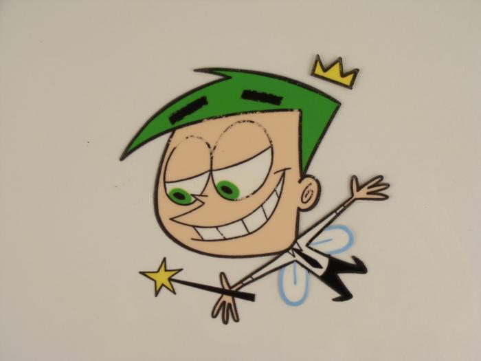 CelThis original hand-painted background from the Nickelodeon TV show Fairly Odd Parents. Timmy Turner is a short, buck-toothed 10-year-old boy with a pink cap who lives in Dimmsdale, a small suburban town with his dim-witted parents. His life is constantly miserable, due to the fact that his parents are rarely home and he is babysat by an incredibly evil teenager, Vicky, and that, generally, no one understands him (as indicated by the show's theme song). But everything changes when he receives two fairy parents: Cosmo and his wife, Wanda and later, their son Poof. Timmy learns that his fairy godparents are capable of granting him any wish he wants within certain limits. However, Timmy's immature nature causes him to sometimes ask for wishes that unintentionally result in disaster, and he and his fairy parents and fairy brother must find a way to "unwish" the wish. Will you look at that, just like magic. Original Production Animated Cel Overall Size of Cel: 10 1/2" x 12 1/2" Very Good ConditionThis is an original hand-painted cel set-up used in the production of an episode of "Fairly Odd Parents." Each one-of-a-kind set-up represents a slight change in position of the characters. When individually photographed and projected in rapid succession, the images appear to move.