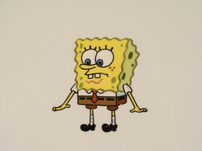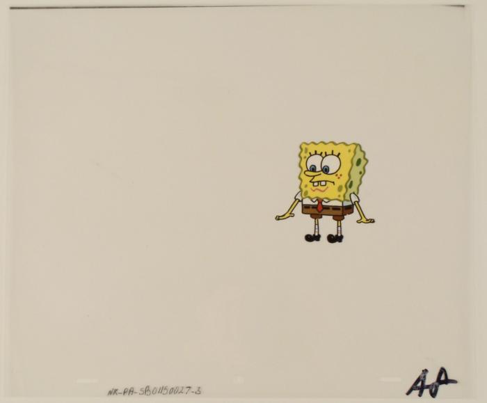 This original animation cel is from the Nickelodeon TV show SpongeBob Squarepants. The story takes place under the deep blue sea in Bikini Bottom, where SpongeBob resides. SpongeBob, who is a yellow, porous sponge, is your typical happy-go-lucky character, as he is always cheerful and enjoys making people laugh. Patrick Star, SpongeBob's neighbor who is a starfish, is your average children's show idiot, as he boasts knowing nothing and is often getting himself into ridiculous situations. Between the homes of these two lies the home of the miserable Squidward, a squid, who is known for being grouchy and playing tricks on SpongeBob and Patrick. Both SpongeBob and Squidward work at the Krusty Krab, a fast food business run by the greedy money-loving Mr. Krabs, a crab, the arch rival of the evil, possibly misunderstood, Plankton. Another neighbor, Sandy Cheeks, an athletic squirrel who normally wears an astronaut's space suit, was introduced in "Tea at the Treedome." She spends most of her time inventing and experimenting. SpongeBob is putting his hands down.Original Production Animated Cel Overall Size of Cel: 10 1/2" x 12 1/2" Very Good ConditionThis is an original hand-painted cel set-up used in the production of an episode of "SpongeBob SquarePants." Each one-of-a-kind set-up represents a slight change in position of the characters. When individually photographed and projected in rapid succession, the images appear to move.